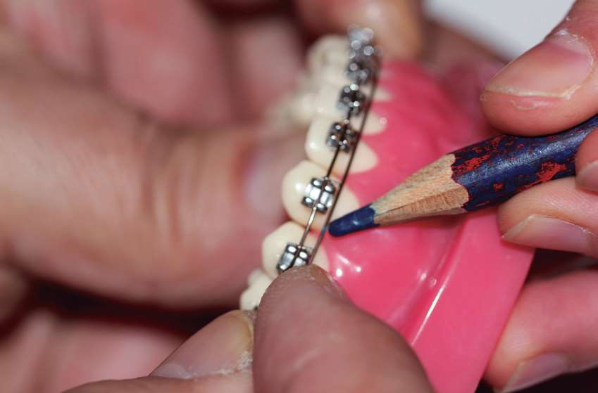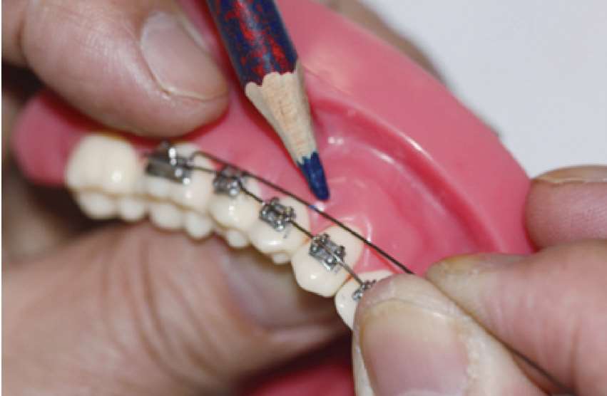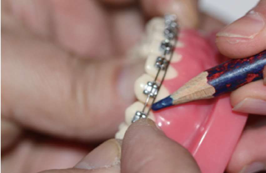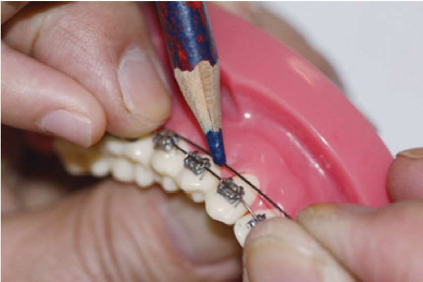 3.将弓丝末端挂钩倒挂在第一磨牙近中,弓丝远中段沿牙面托槽龈缘置放,在尖牙与第一前磨牙之间画线做标记点(图7-2-8~图7-2-10)。