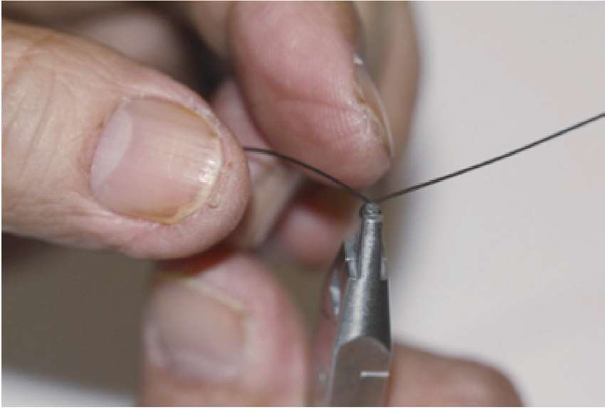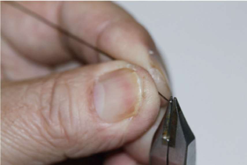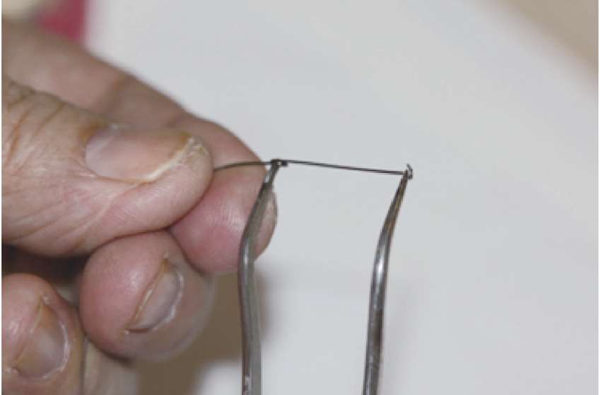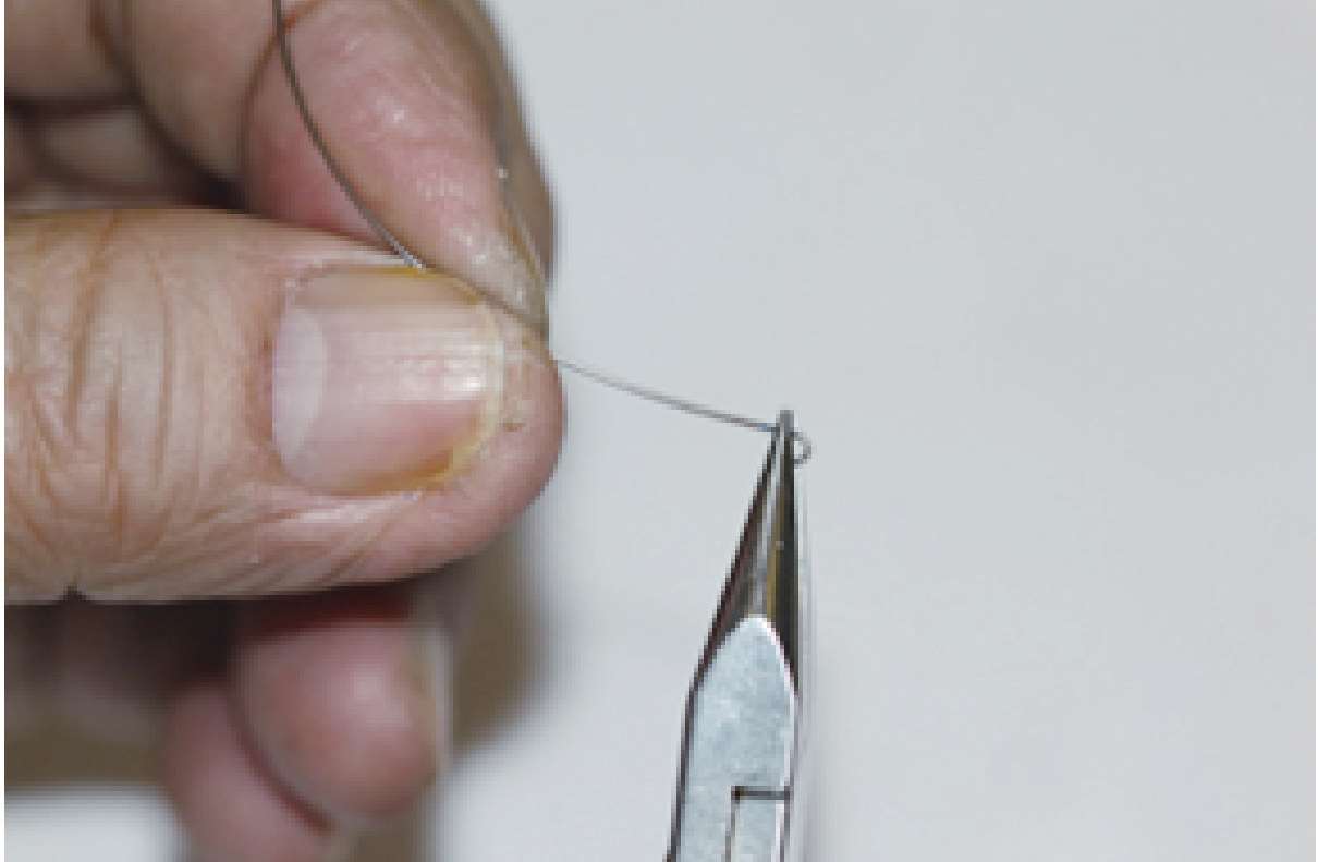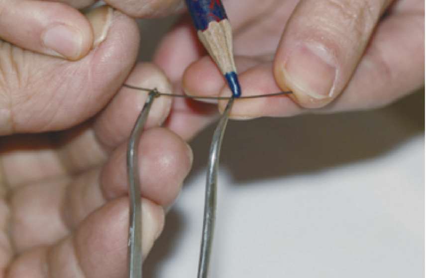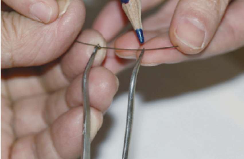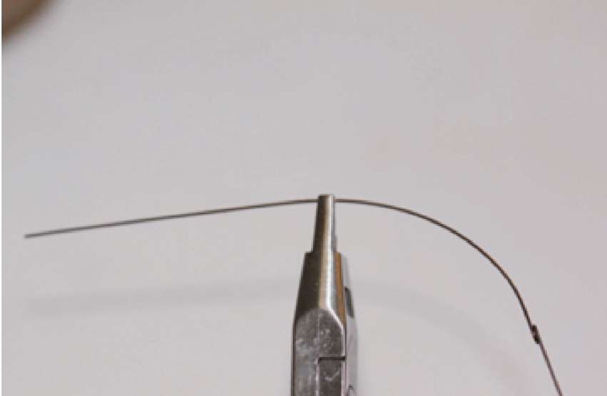 1.一根0.018in的澳丝,测量牙模弓形长度,确定弓丝长度。使用细丝钳,圆喙朝外钳夹弓丝末端,弯折成与弓丝平行的小钩(图7-2-1~图7-2-4)。