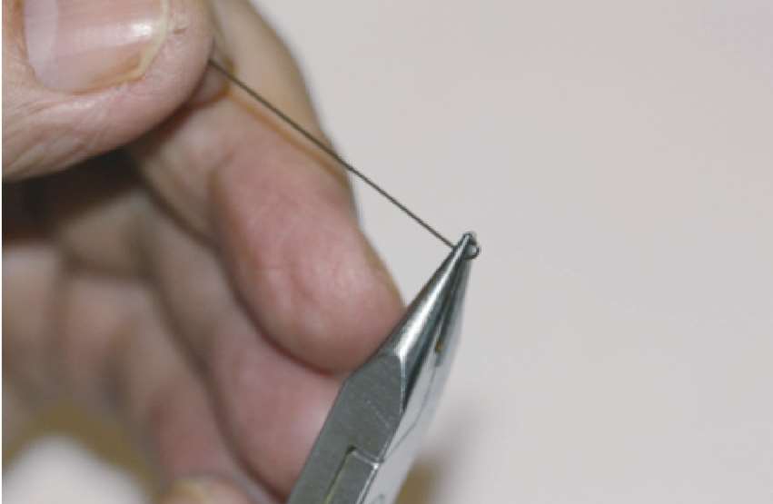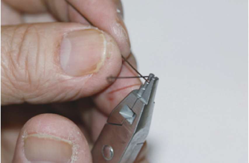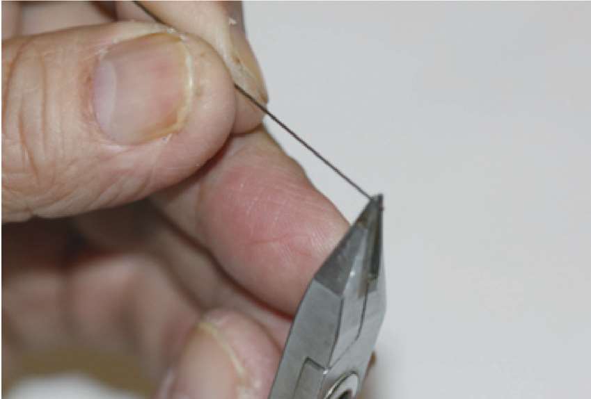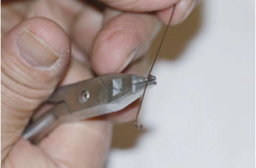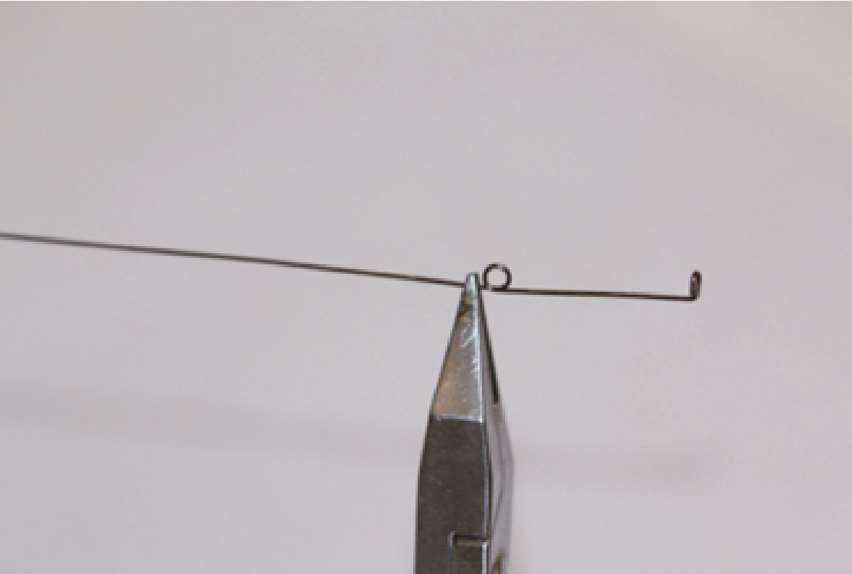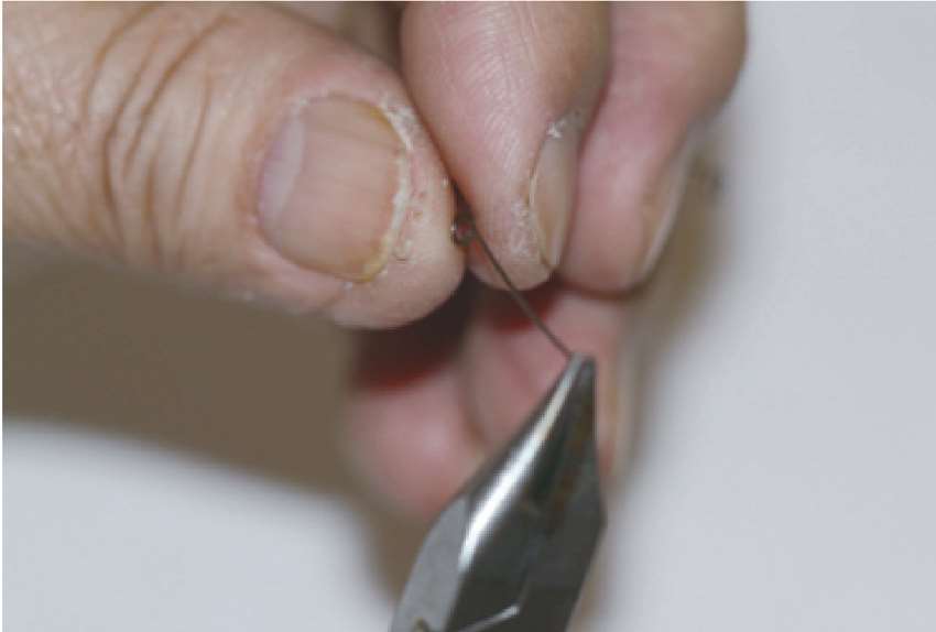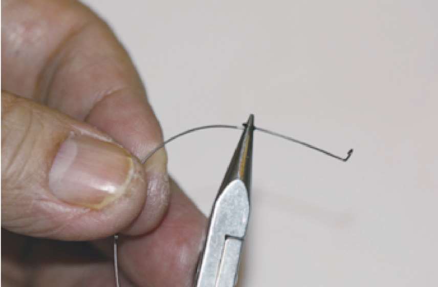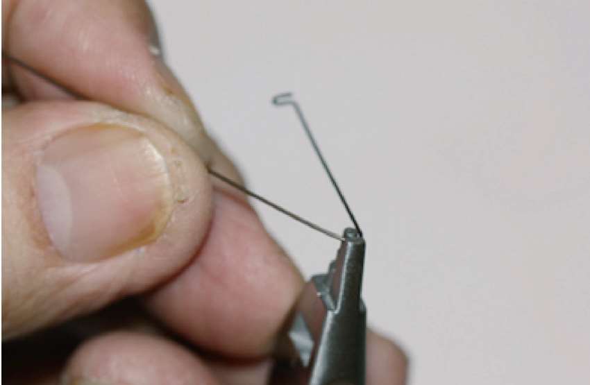 12.更换细丝钳,圆喙朝外钳夹弓丝弯折平行小钩,然后方喙朝下钳夹小钩向下弯折90°形成末端挂钩(图7-2-32~图7-2-36)。