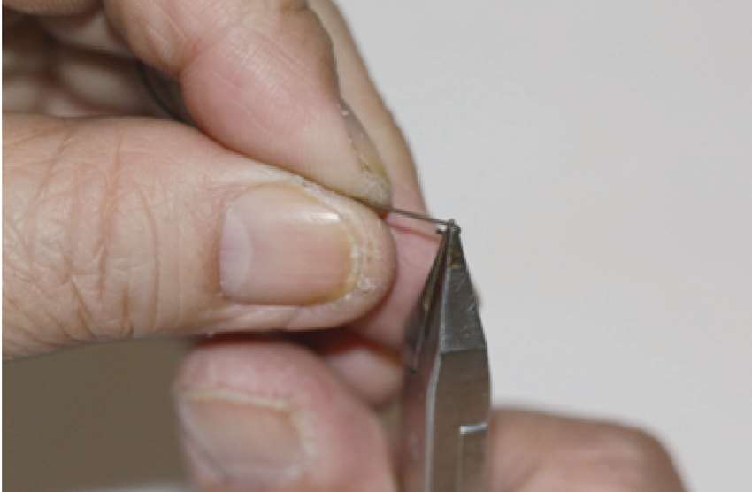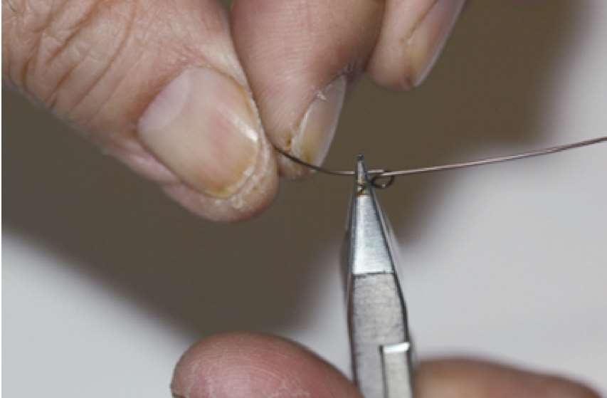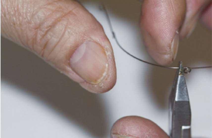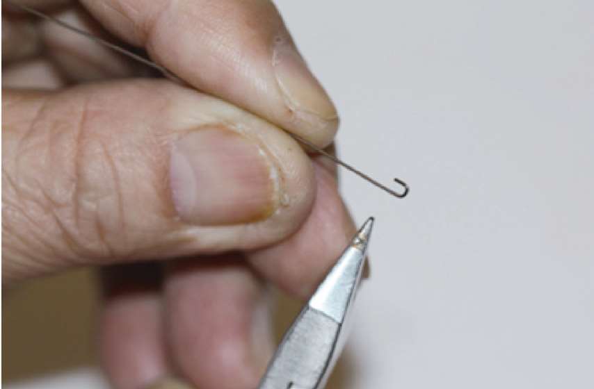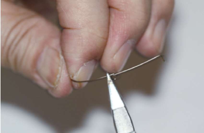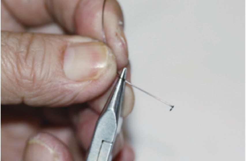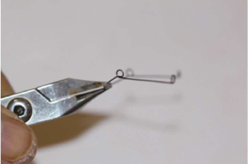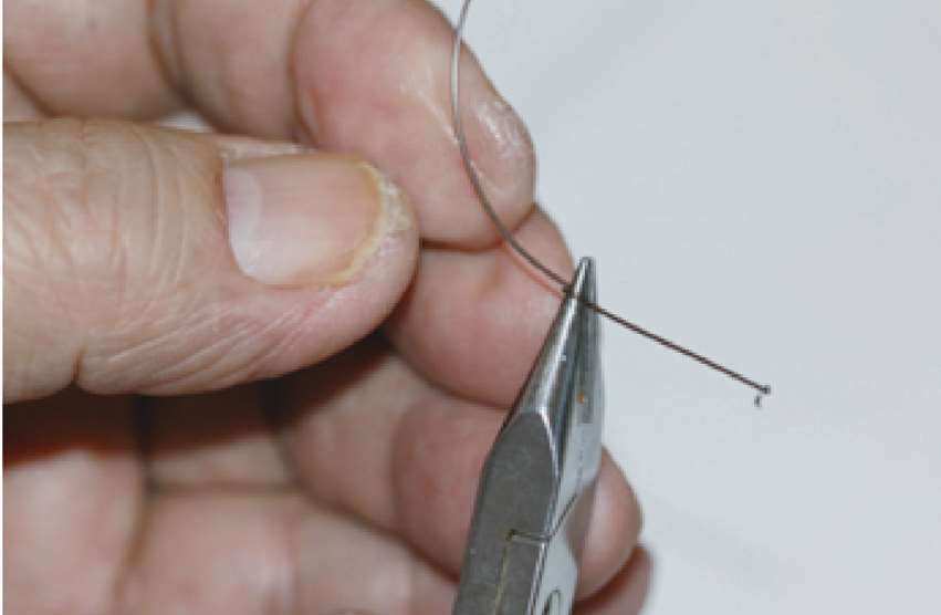 12.更换细丝钳,圆喙朝外钳夹弓丝弯折平行小钩,然后方喙朝下钳夹小钩向下弯折90°形成末端挂钩(图7-2-32~图7-2-36)。