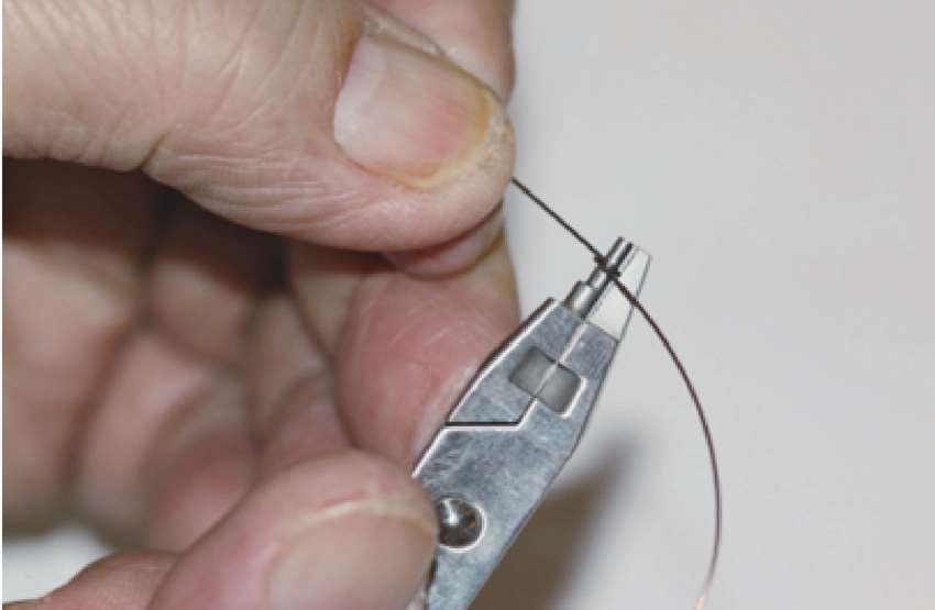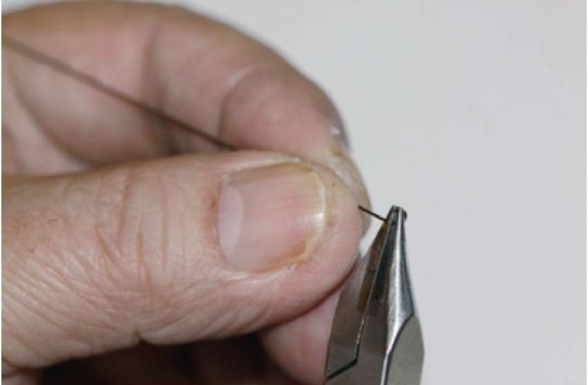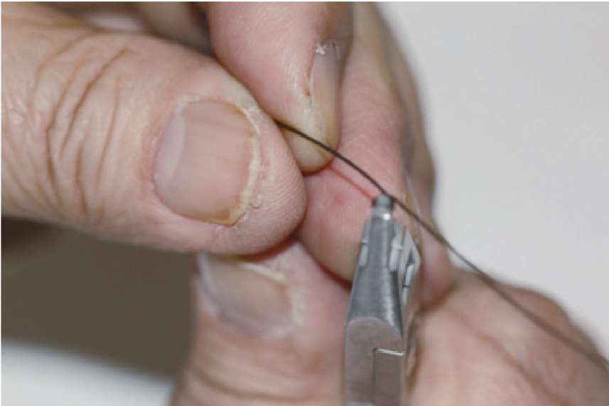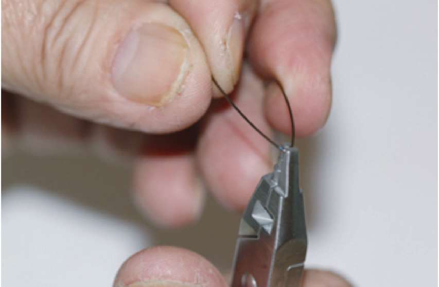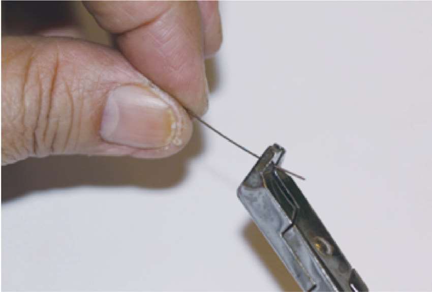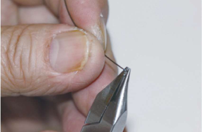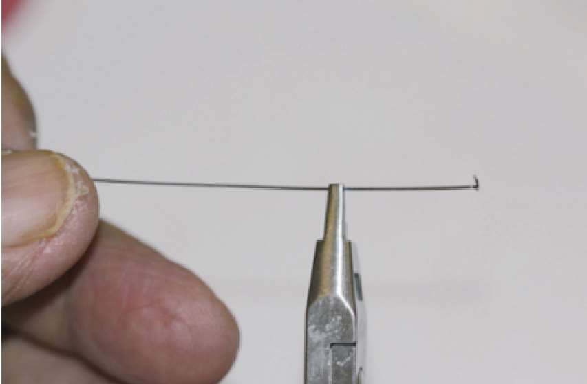 2.钳子方喙向下,钳夹住弓丝末端小钩,弯折成90°形成挂钩(图7-2-5~图7-2-7)。