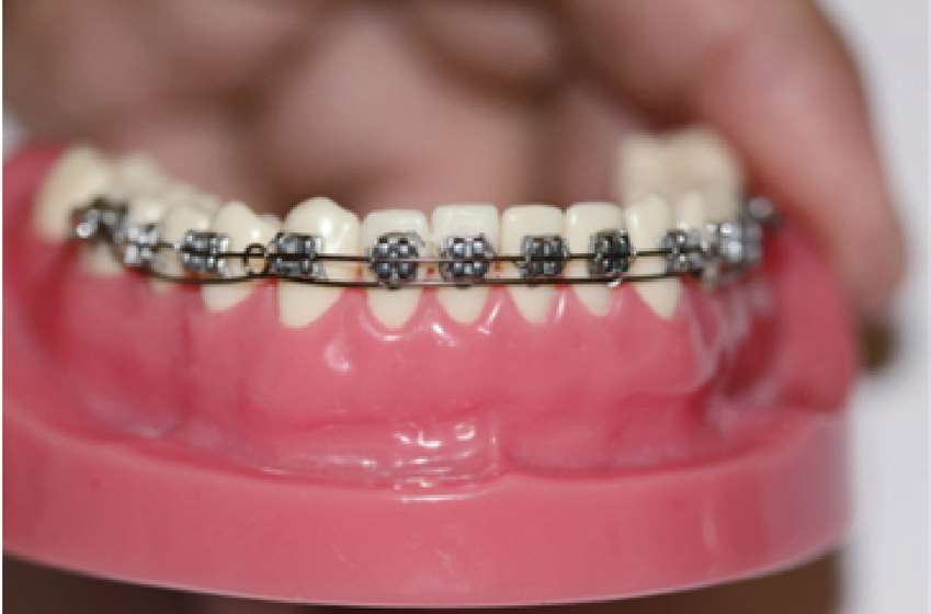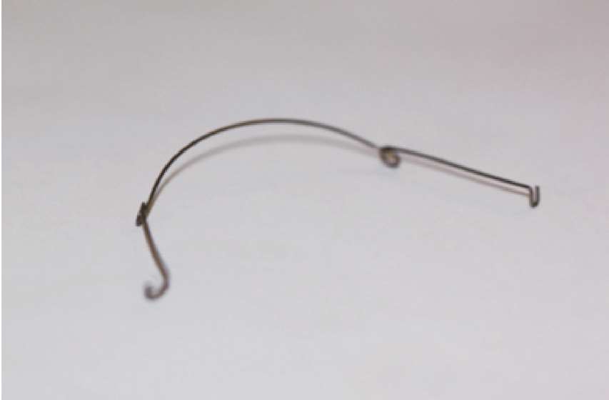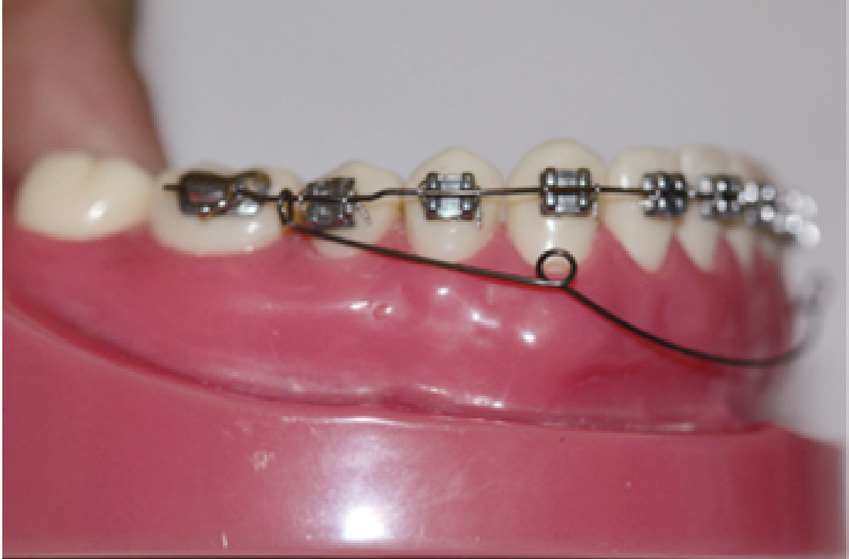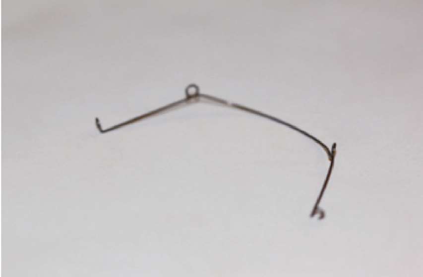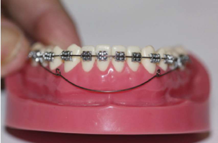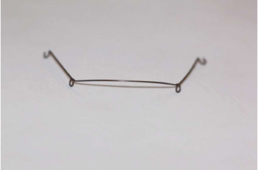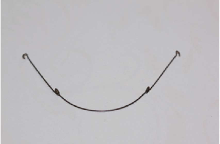 1.其两侧的蛤蟆脚(挂钩)是从里朝外倒置挂在正畸主弓丝上的。