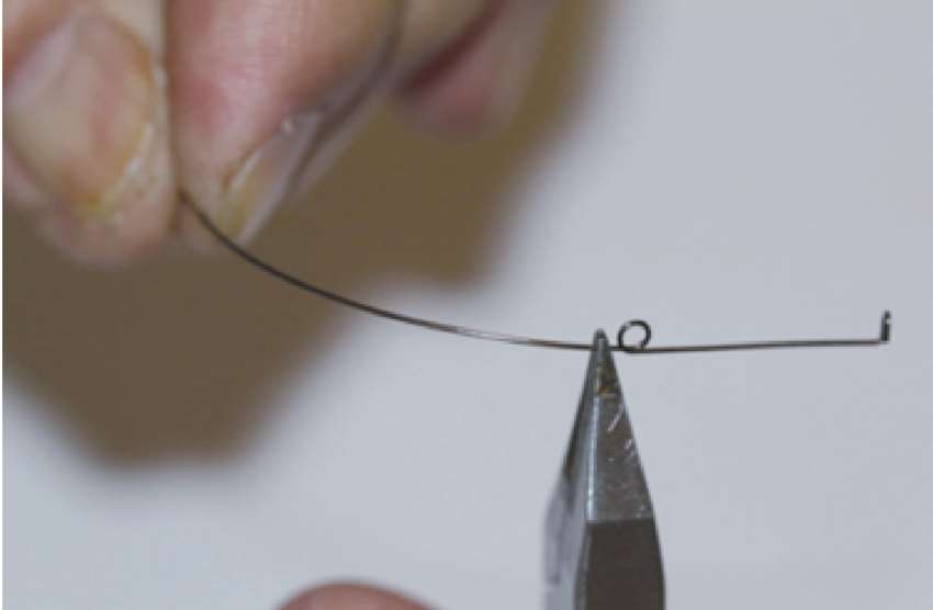 5.弓丝绕圆喙转动弯制成小圈曲,小圈曲曲突方向与挂钩方向一致(注:小圈曲的弯制需用Kim钳的圆喙弯制)(图7-2-13~图7-2-15)。