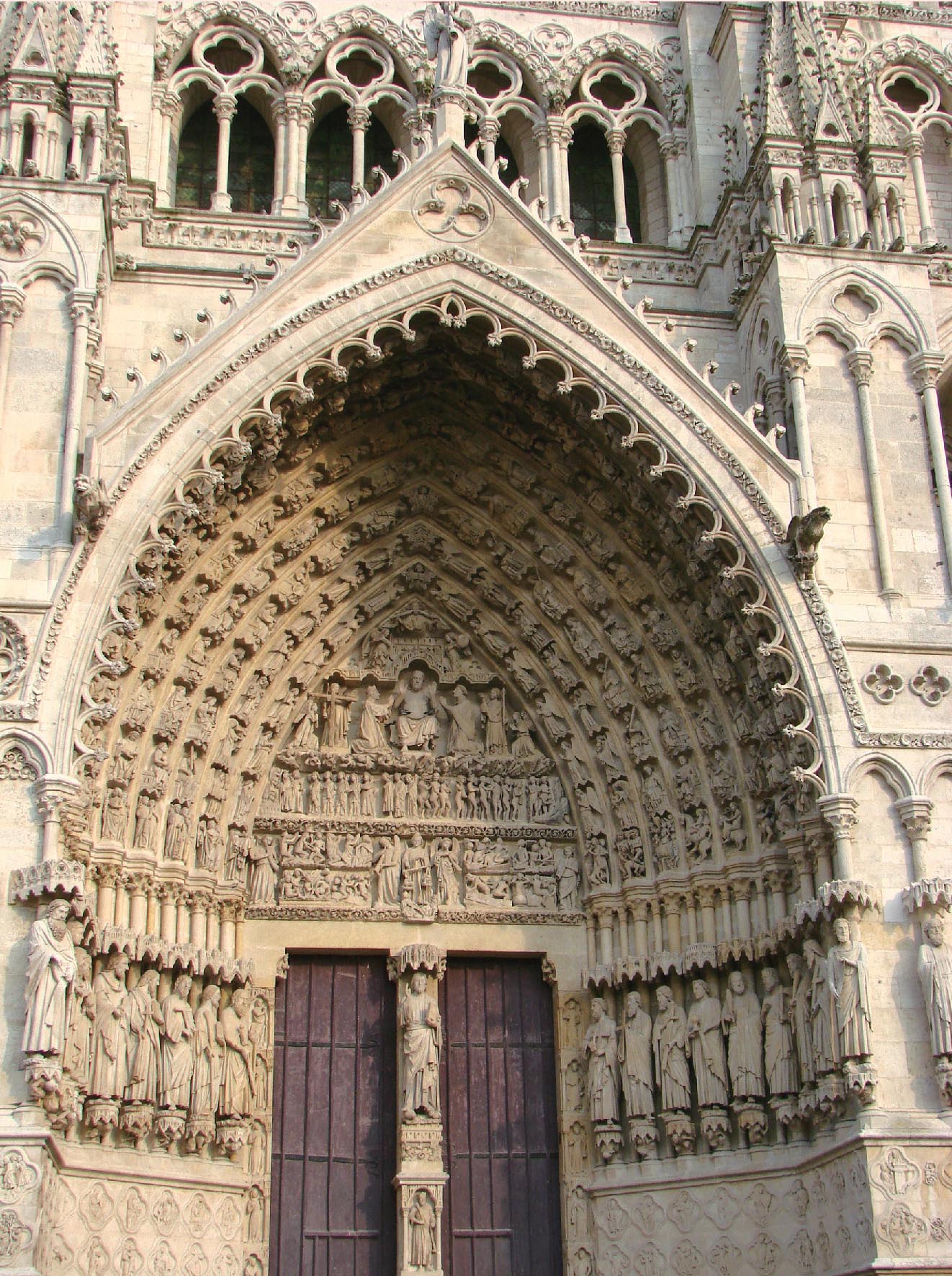 12.亚眠安大教堂:正门。门洞内外上下左右雕像林立,中央为基督像,两侧及四周为使徒及先知像
