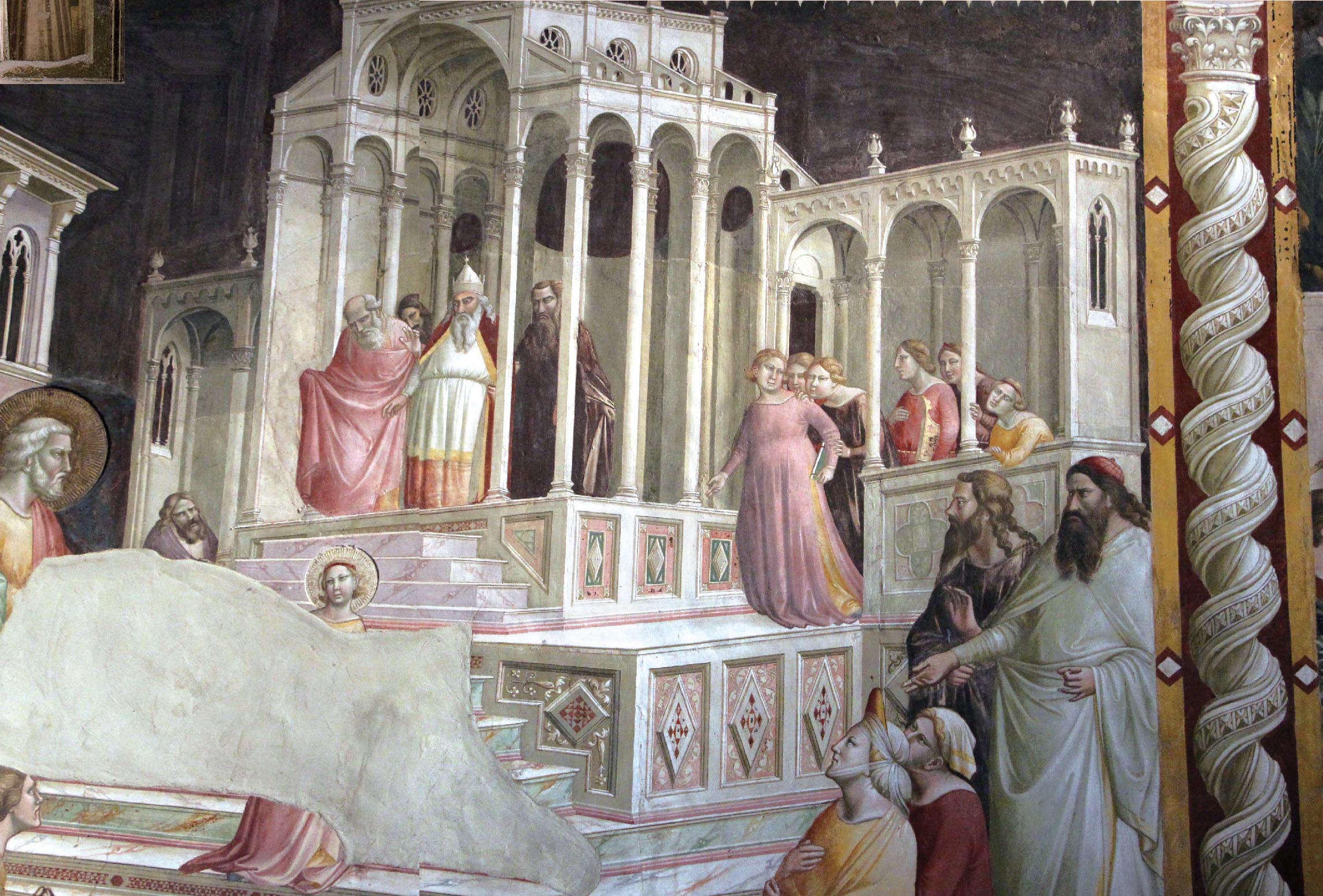 17.迦提:《圣母初入圣殿》,壁画。图14至17属于意大利文艺复兴绘画的第一期(十三至十四世纪),宗教情绪极重,虽开始追求写实,但技术幼稚,人体解剖尚未通晓