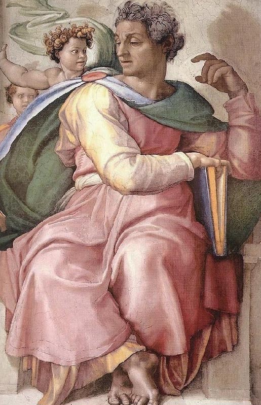 30.米开朗琪罗:《先知伊赛亚》,西克斯庭教堂天顶画之一,局部。米开朗琪罗在文艺复兴思潮中代表苦闷与英勇斗争的近代精神,主要是力的表现