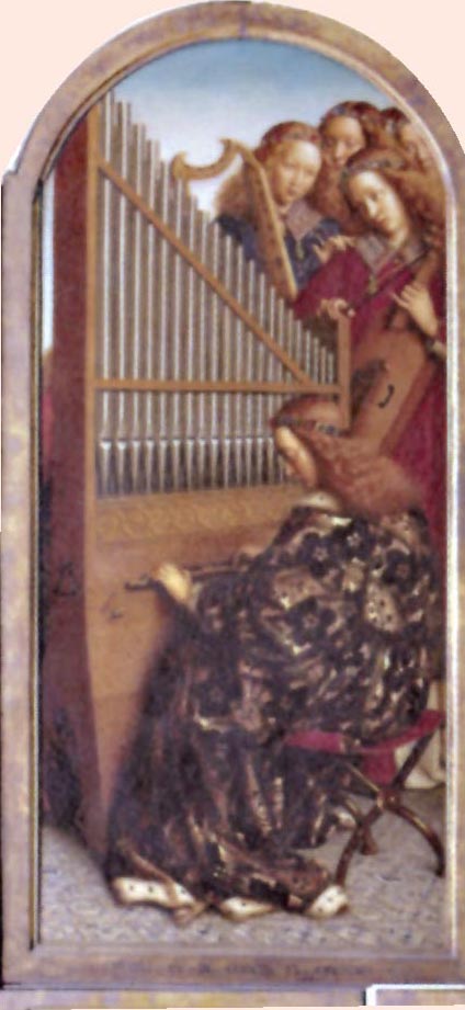45.梵·埃克:《神秘的羔羊》局部,表现奏乐的天使(局部)。《神秘的羔羊》为祭坛装饰画,共十二幅