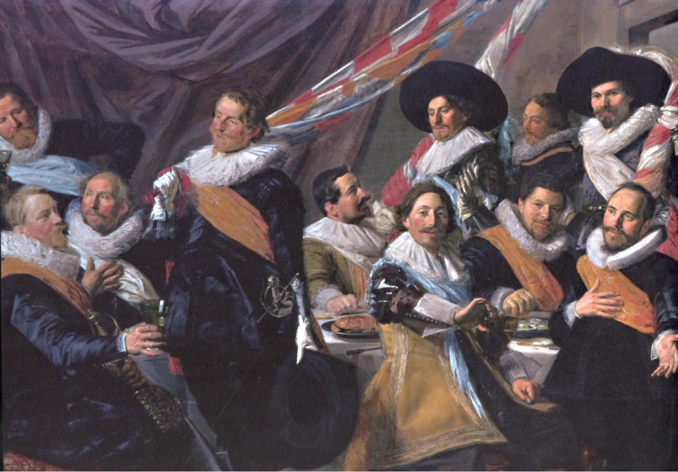 62.哈斯:《圣乔治射箭会干事的聚餐》。图62至71属于尼德兰绘画的第三高潮,大致与第二高潮同时。北七省与南十省的分离促成了荷兰画派的特殊面目