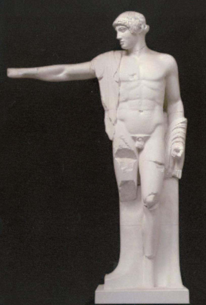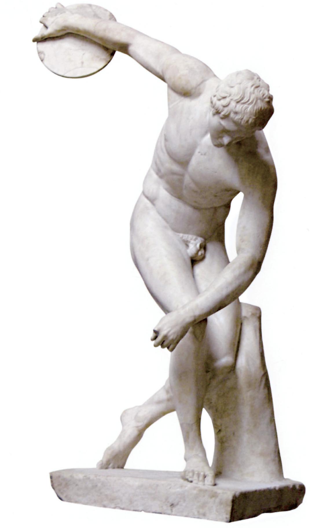 78.迈隆:《掷铁饼者》,公元前五世纪中叶。此系复制。77、78两像都表现复杂与猛烈的动作,但面部表情仍极平静,这是希腊雕塑的特征之一