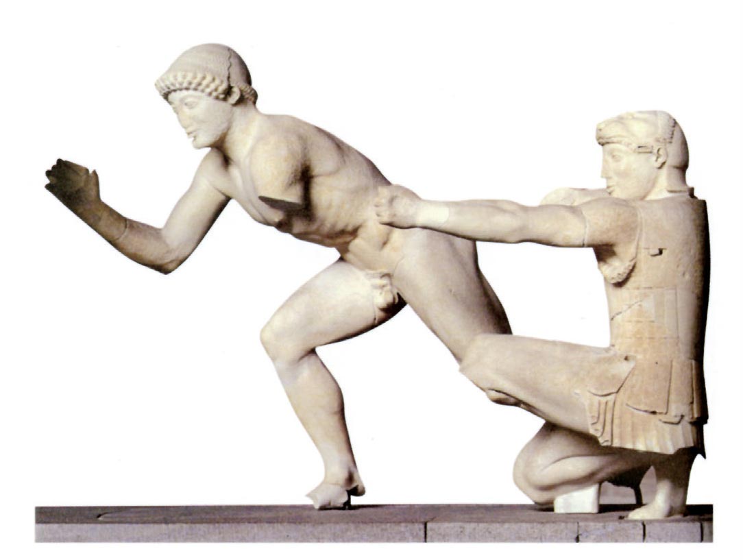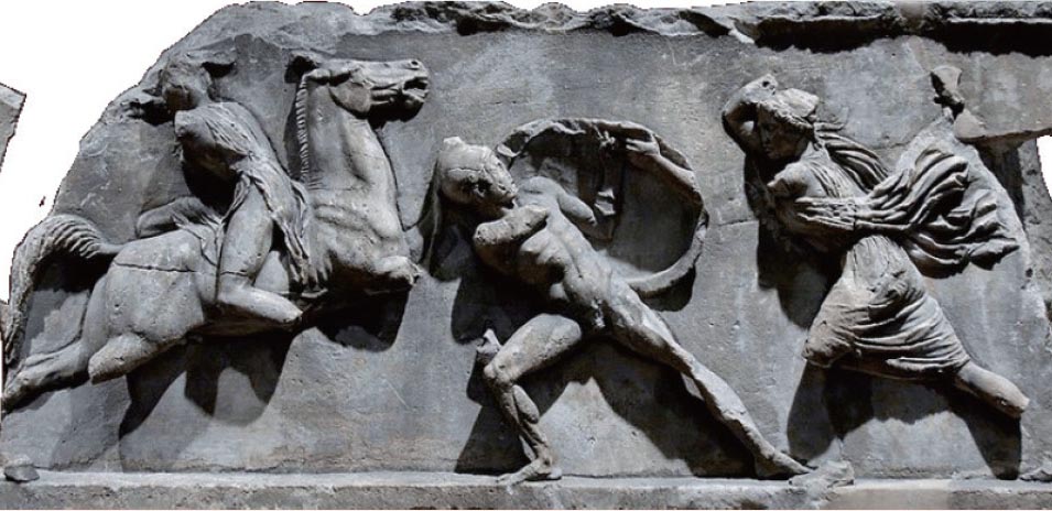 85.哈利卡那萨斯灵庙的楣梁雕塑之一部分。表现希腊人与安马孙人的搏斗。相传为斯科巴斯作,公元前四世纪中叶。斯科巴斯在希腊雕塑家中首先表现热情