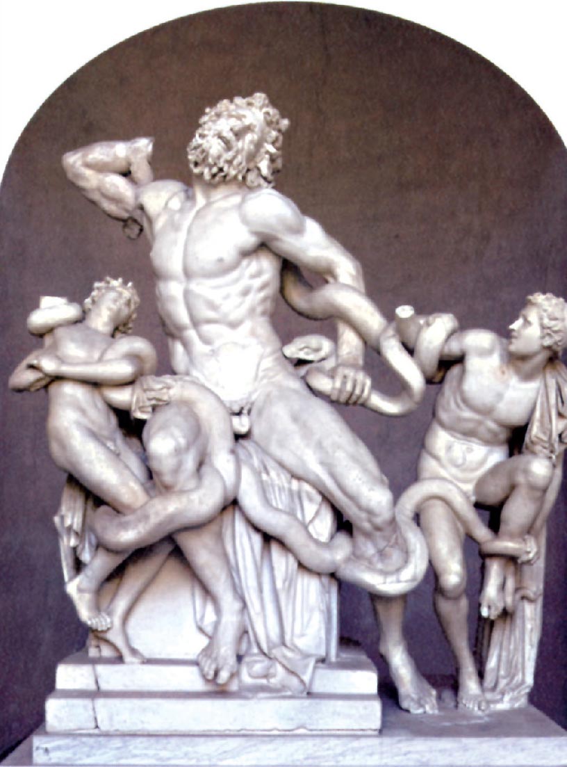89.《雷奥科翁》,神话中说雷奥科翁和两个儿子被蛇妖困死。公元前一世纪的作品。图88与89已属希腊雕塑后期,强烈的感情与痛苦的表现代替了清明恬静的境界