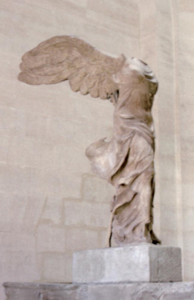 86.《萨摩特累斯的胜利女神》,公元前四世纪末。身有两翼的胜利女神迎风立于船首,口吹号角。庆祝公元前三〇六年战败托雷密之舰队,图76至86属于希腊雕塑的黄金时代