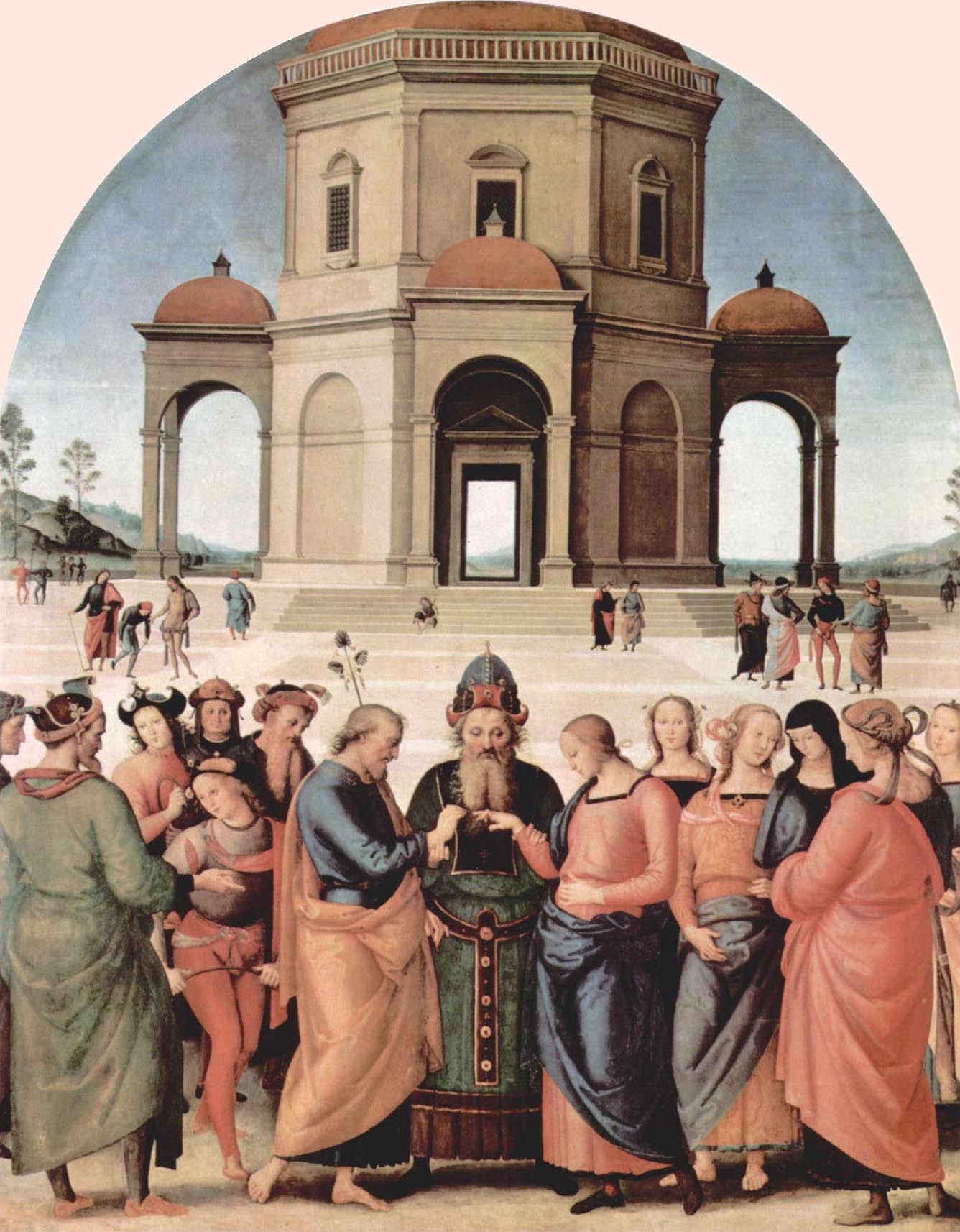 34.拉斐尔:《童贞女的婚礼》。拉斐尔除继承希腊艺术的清明恬静与中庸典雅之外,另有一种妩媚的世俗气息