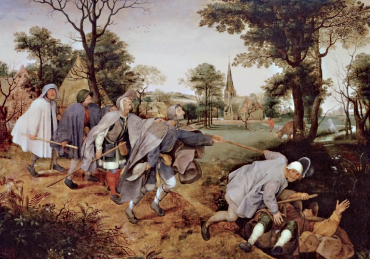 54.老布勒开尔:《盲人的寓言》,描写西方的俗语:“瞎子带瞎子,一齐落水。”——图51至54属于尼德兰绘画的第二期(十六世纪的最后七十年),在强大的意大利影响之下,仍保持法兰德斯民族的特征