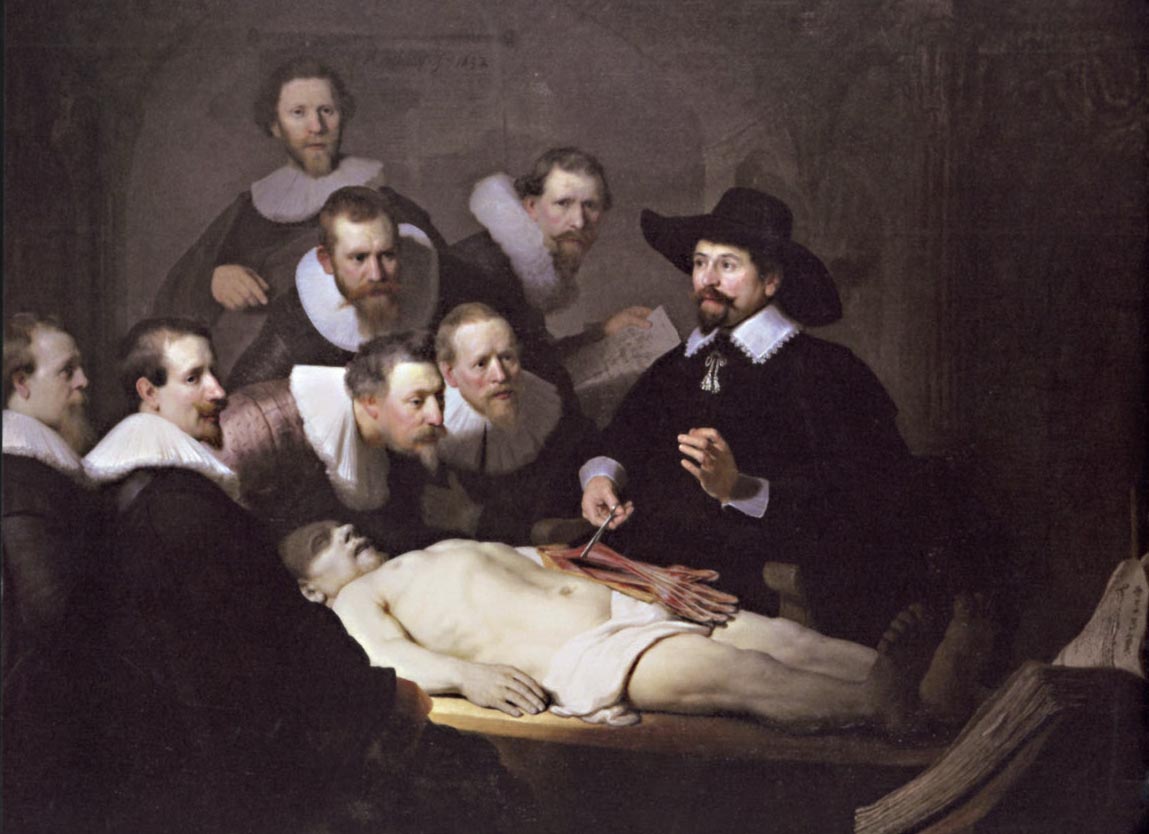 69.伦勃朗:《丢普教授的解剖课》。伦勃朗二十五岁时作,尚在追求人物的生动与构图的统一