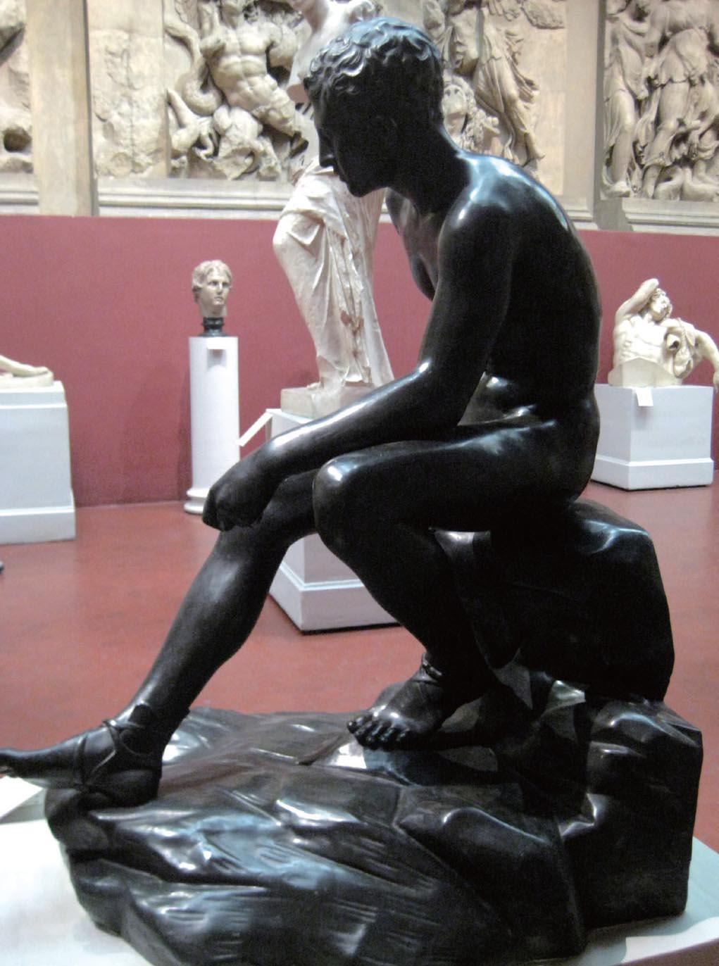 84.来西巴斯:《赫美斯神在休息中》,青铜像,公元前四世纪中叶。此系复铸。赫美斯是为天上诸神送信跑腿的使者,又是雄辩与商业的神。此像表现他途中坐在岩石上歇脚。来西巴斯将头与身体的比例改为一比八,更趋于修长,轻灵,典雅