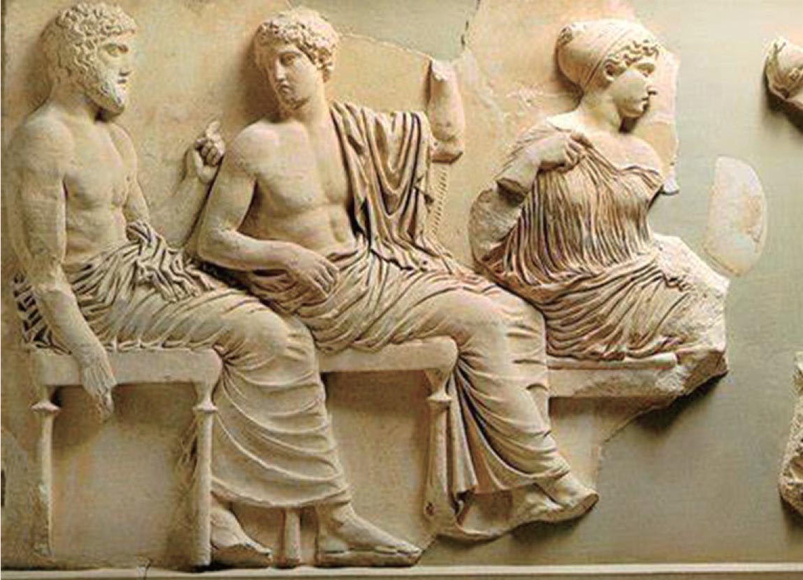 79.巴德农神庙东部三角墙下的楣梁雕塑,代表天上的神明:公元前五世纪中叶