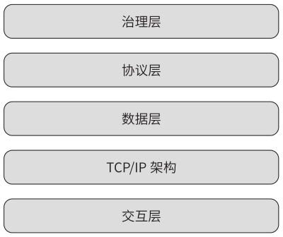 讲到这里你应该明白了,互联网实际上是搭建起了数字世界的基本架构,那么,元宇宙作为互联网的升级版,要想实现我们在前面总结的“平行世界”“独立身份”和“利益打通”的功能,现有的架构肯定是不够的,它需要在互联网的基础架构之上继续叠加,还需要增加交互层、数据层、协议层和治理层四个层次。