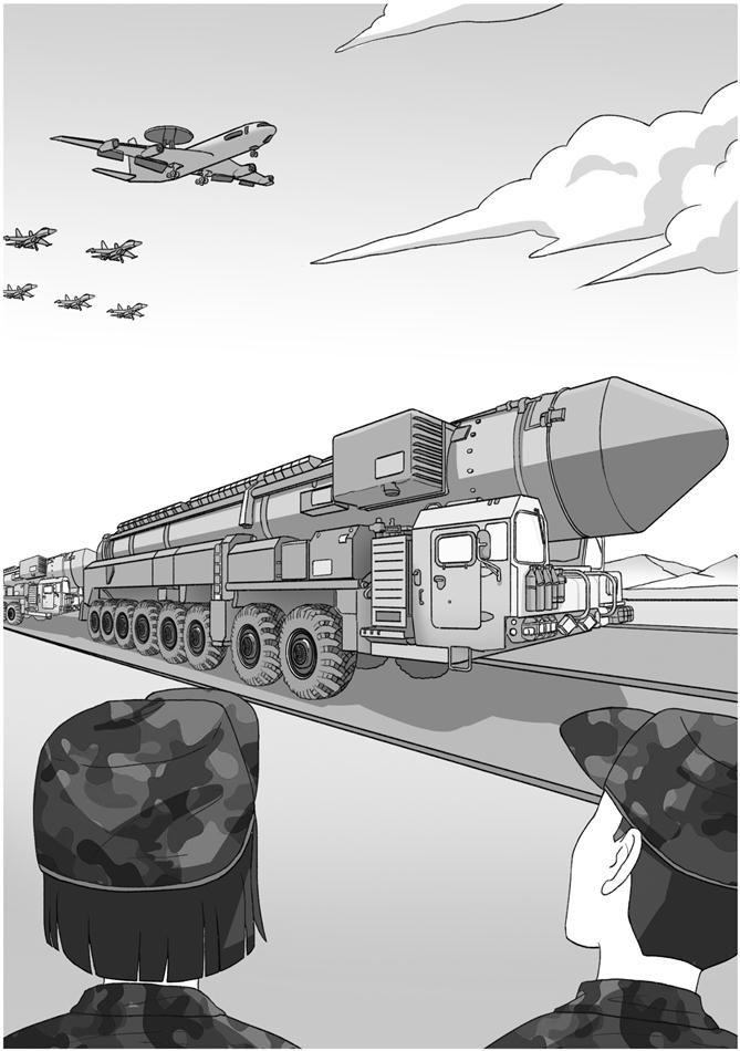 在大阅兵的活动中,T小队的少年们看到一辆辆战略导弹发射车从检阅台前驶过,个个兴奋不已。