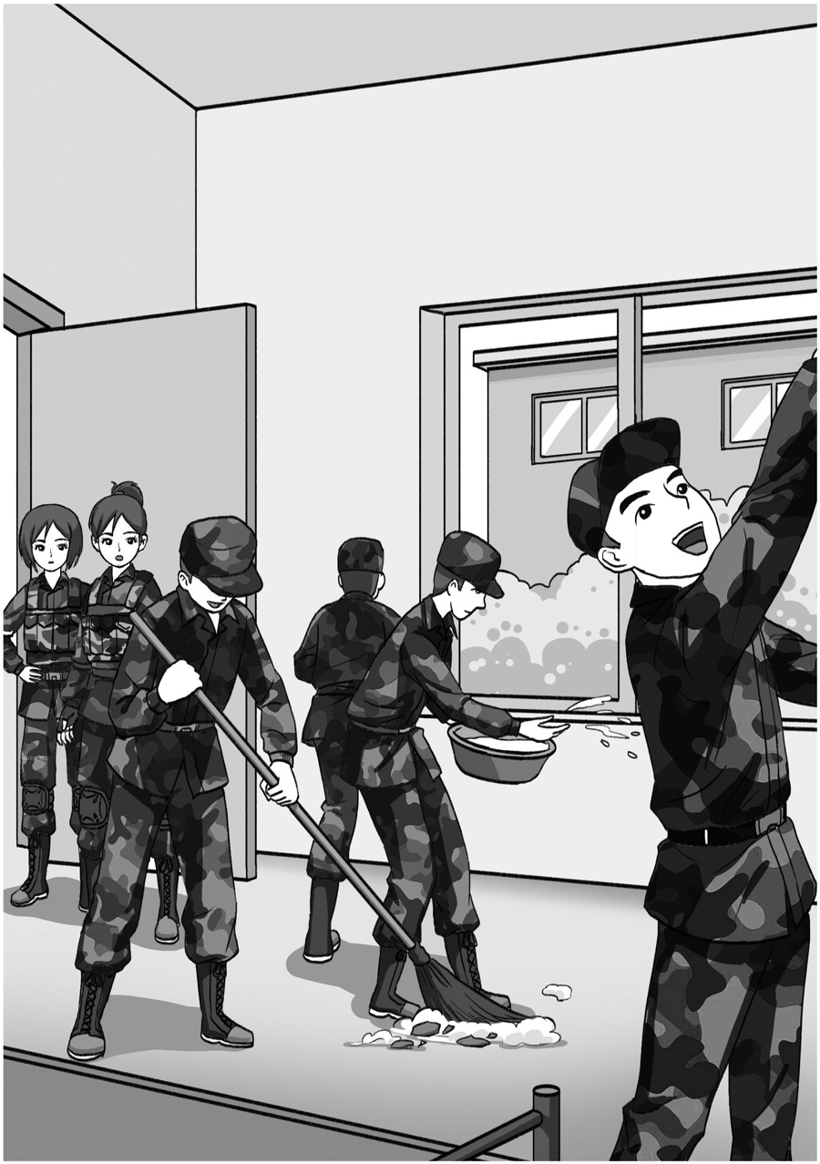 屋里的梅花雀、绿头鸭和华南虎都愣住了,心想这是怎么回事?三个人还没想明白,十来个男兵就走进来了。他们有的端着脸盆,有的拿着抹布,有的握着笤帚,进屋之后二话不说,就直接开始干活。