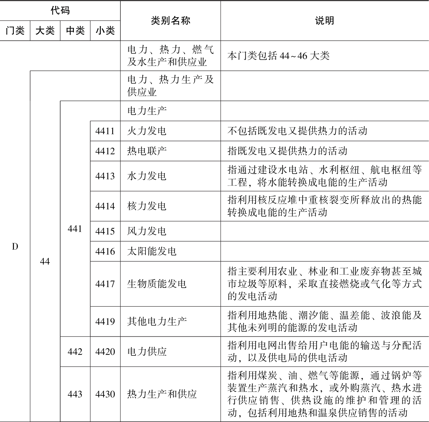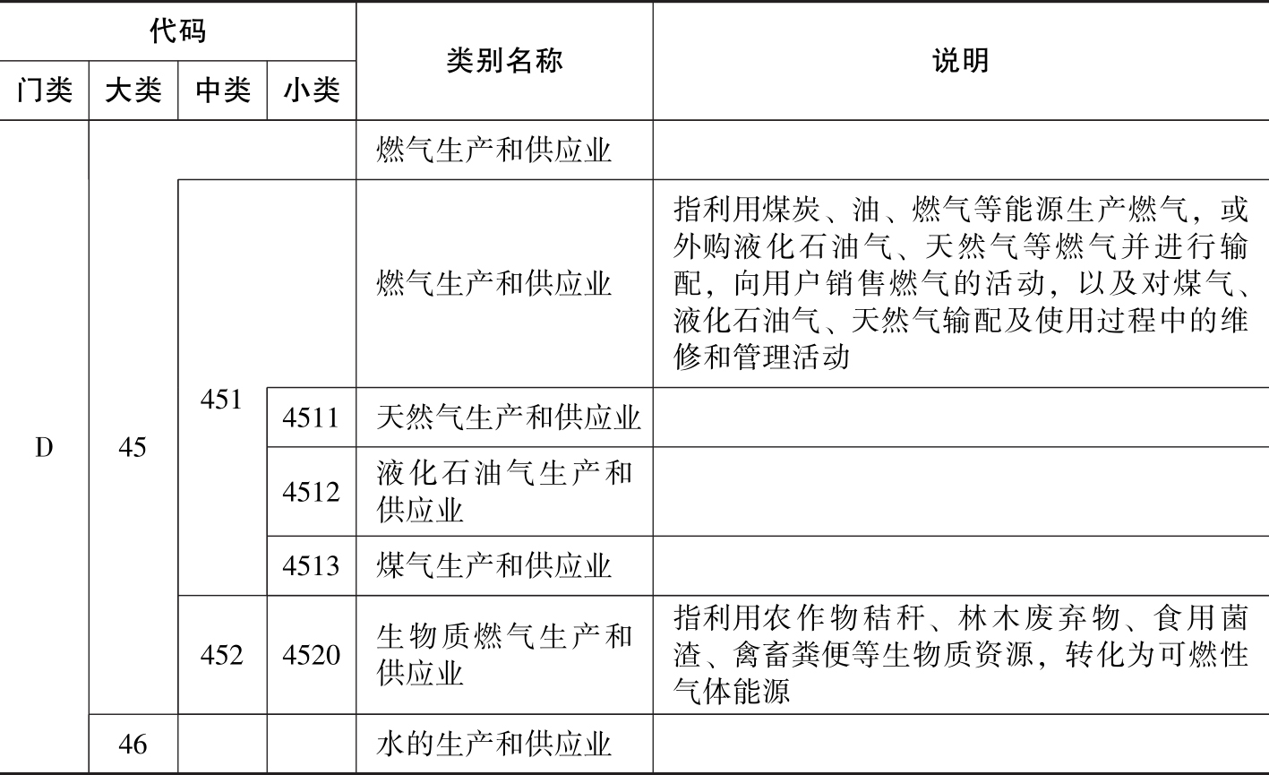 目前执行的国民经济行业分类标准是2017年修订颁布的,即《国民经济行业分类》(GB/T 4754—2017),与能源生产直接相关的类别主要是D电力、热力、燃气及水生产和供应业,见表1-3。