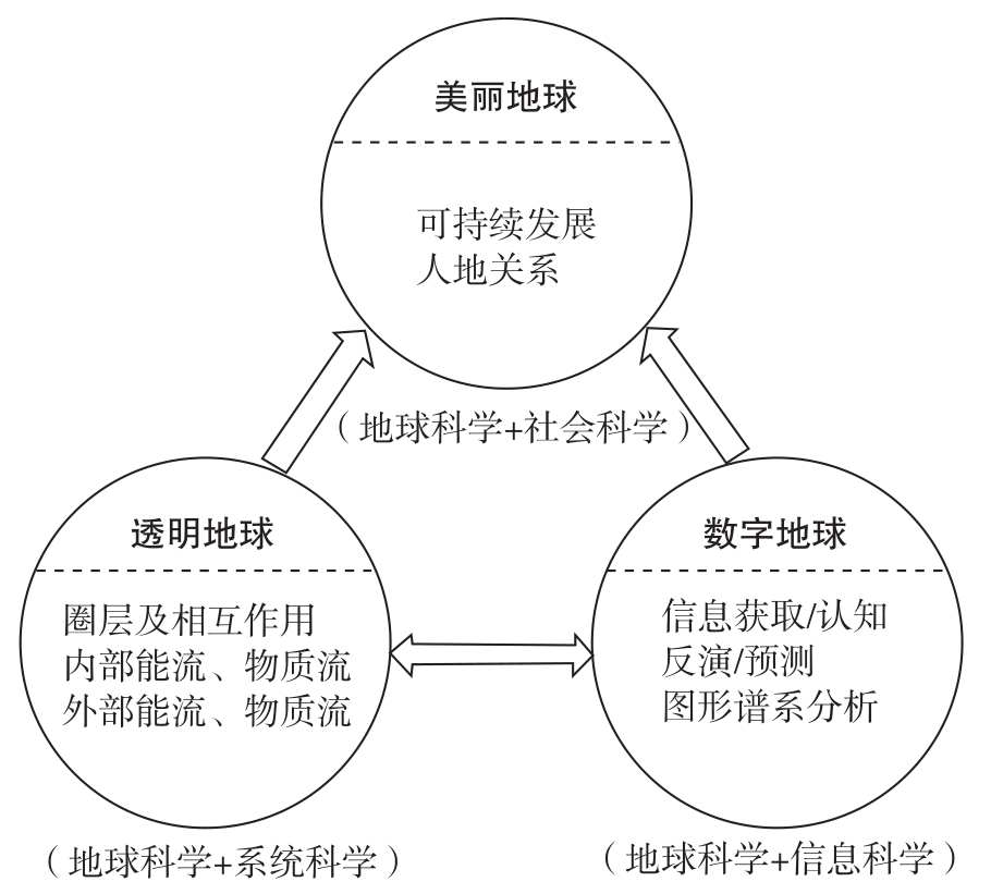 从学科上,“透明地球”依托地球科学(地质学、地理学、大气科学、地球化学、地球物理学、生态学)与系统科学的交叉渗透,强调应用系统科学的观点来研究系统内(外)部的物质、能量的相互作用;“数字地球”依托地球科学与信息科学的深度融合,强调信息论、计算机理论和人工智能理论来研究各种与地球相关的信息观测、集成、反演和预测,以实现地球的数字化、可视化表达,以及多尺度、多分辨率动态交互;“美丽地球”则依托地球科学与社会科学的交叉渗透,强调利用社会学、哲学、生态文明理论等来研究人地关系,以实现可持续发展问题。