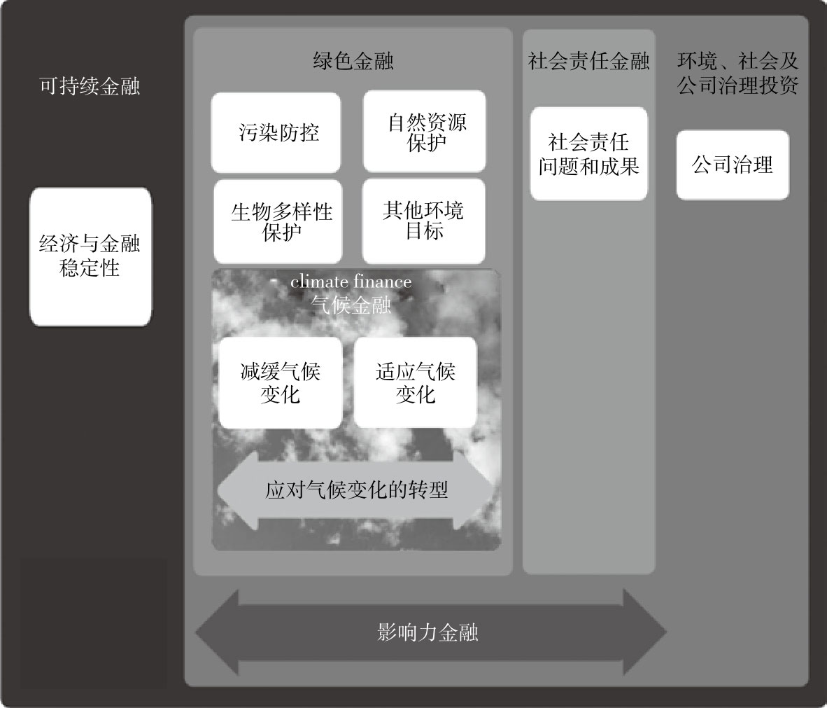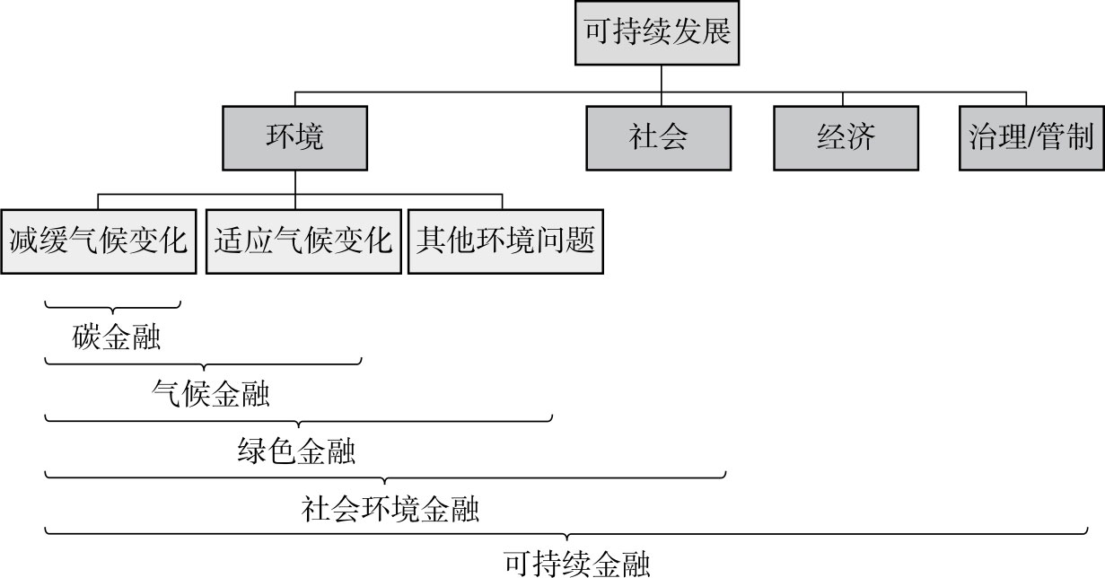 根据UNEP FI针对可持续金融系统设计的一份调研报告( UNEP Inquiry : Design of a Sustainable Financial System ),可持续金融包括广泛的环境、社会、经济和公司治理的内容;而绿色金融范围相对狭窄,仅针对环境问题,那些只针对减缓气候变化或适应气候变化影响的范畴则更窄。
