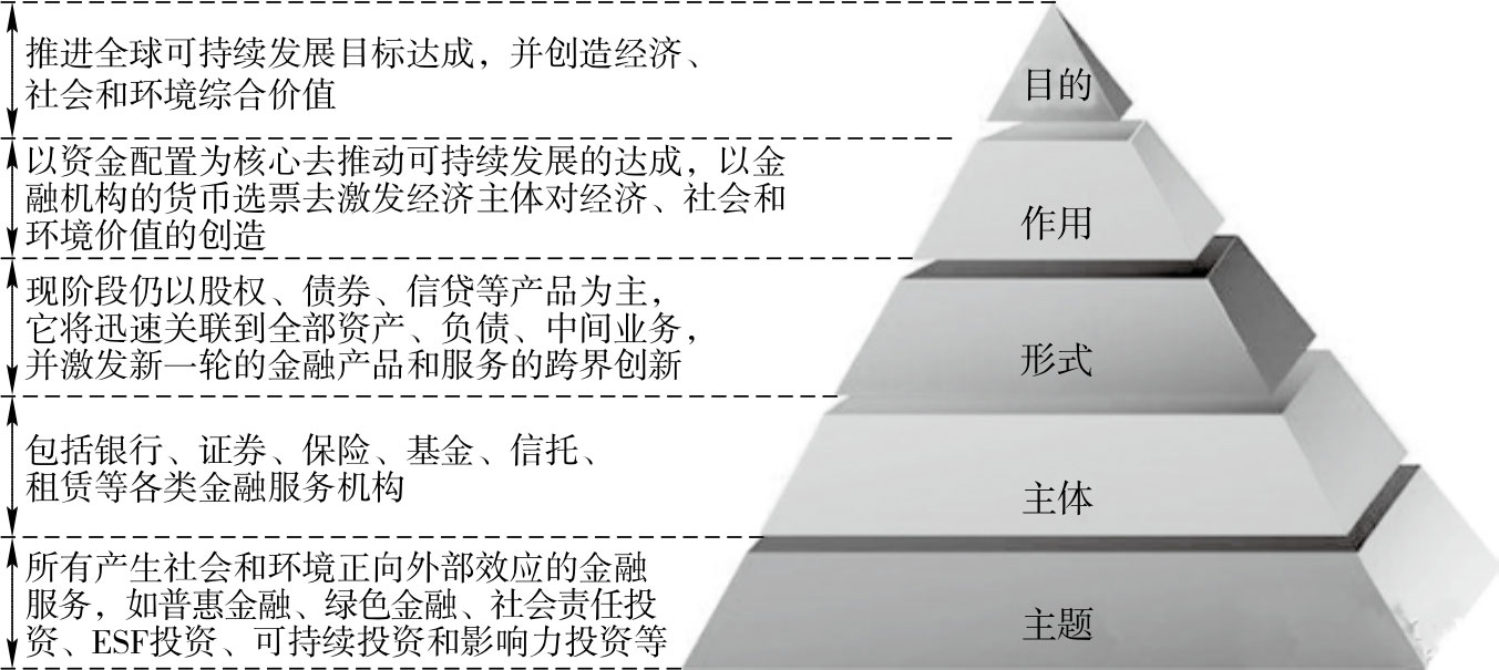 可持续金融的分类尚未建立清晰的规则,其形式现阶段仍以股权、债券、信贷等产品为主,并开始关联到全部资产、负债、中间业务,激发新一轮的金融产品和服务的跨界创新;其主体广泛包括银行、证券、保险、基金、信托、租赁等各类金融服务机构;其主题涵盖了所有产生社会和环境正向外部效应的金融服务,如普惠金融、绿色金融以及社会责任投资、ESG投资、可持续投资和影响力投资等。