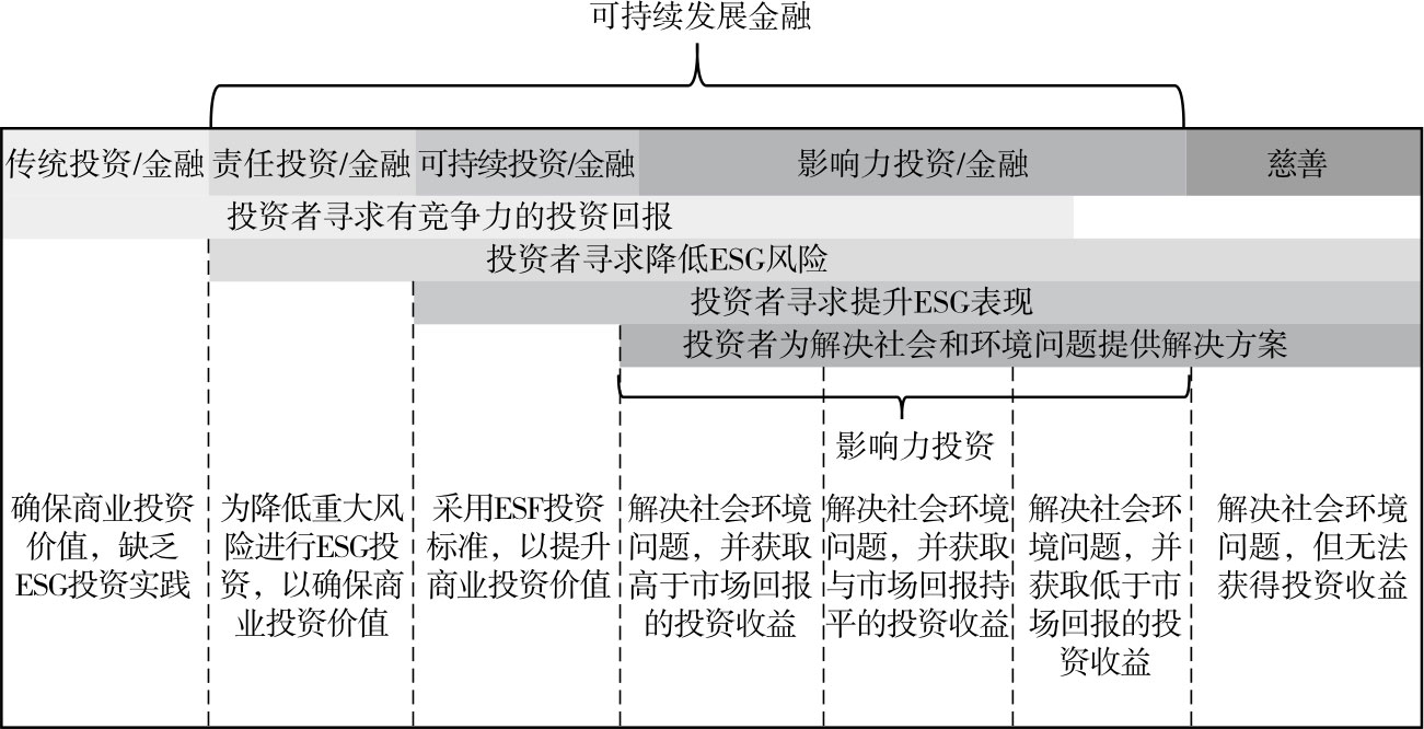 为扼要阐释资本对商业回报(利)和社会环境诉求(义)的不同取向,欧美学者以义利“光谱图”的形式(见图2-4)展示了可持续发展金融所包含的各个主题性投资的差异定位。传统投资仅注重商业回报、忽视社会环境诉求,有“逐利忘义”属性;责任投资以负向筛选等为主要手段,符合ESG底线原则,其最终目的是为规避风险,有“不作恶逐利”属性;可持续投资以正向筛选等为主要手段,主动采纳ESG投资标准,最终的目的在于提升商业投资价值,有“逐义为利”属性;影响力投资首次提出以投资方式解决社会环境问题,有“以义为先”属性。