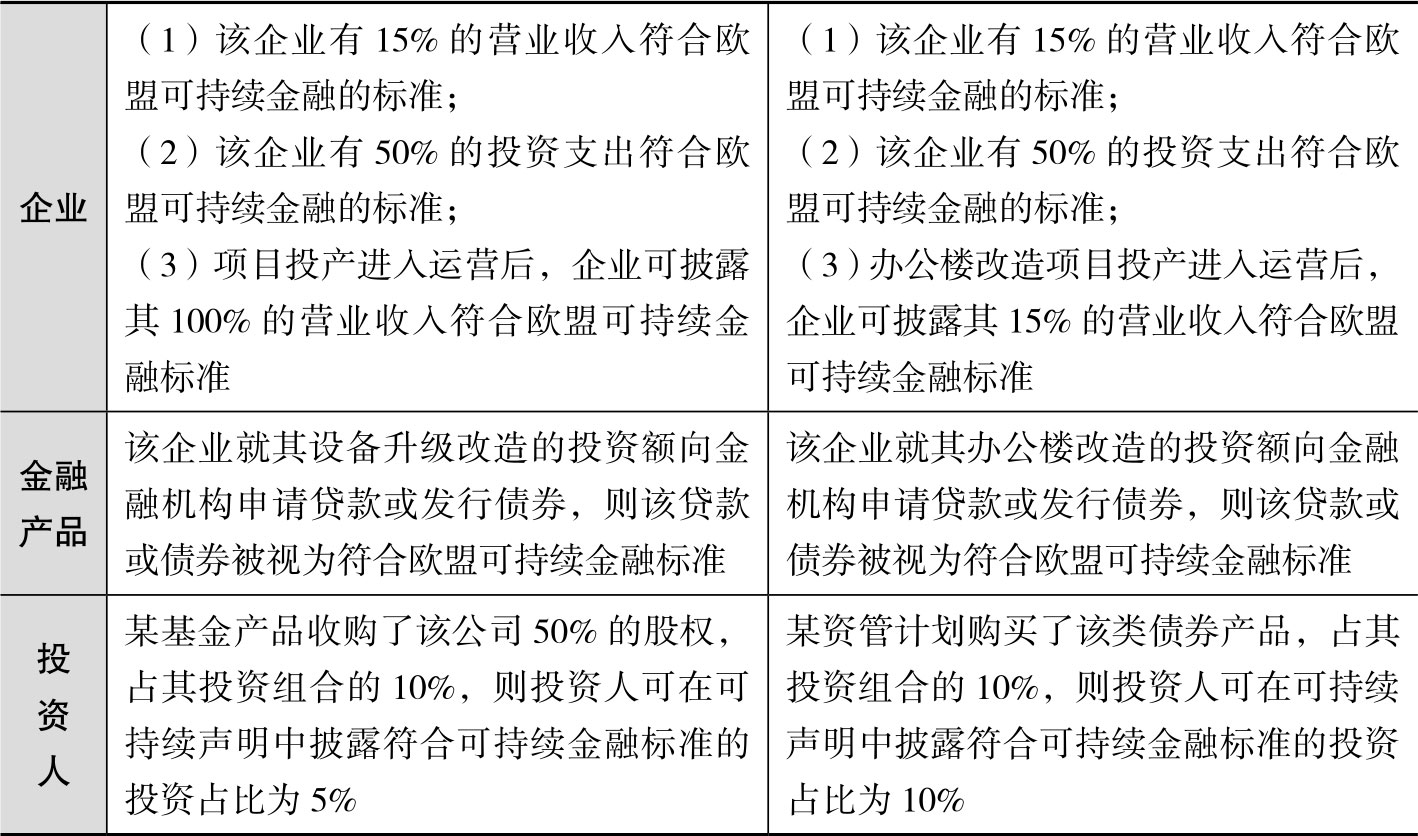 (2)对金融机构的披露要求为以下三点:可持续投资计算方法说明;投资组合对环境目标的贡献;符合可持续金融标准的投资占比。