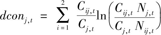 其中, dcon 表示城乡居民消费差距, C it 表示农村或城市在 t 时期的消费量, C t 表示两组消费的总消费, N t 表示 t 时期的总人口, N it 表示 t 时期城市或农村的人口, j 表示地区。