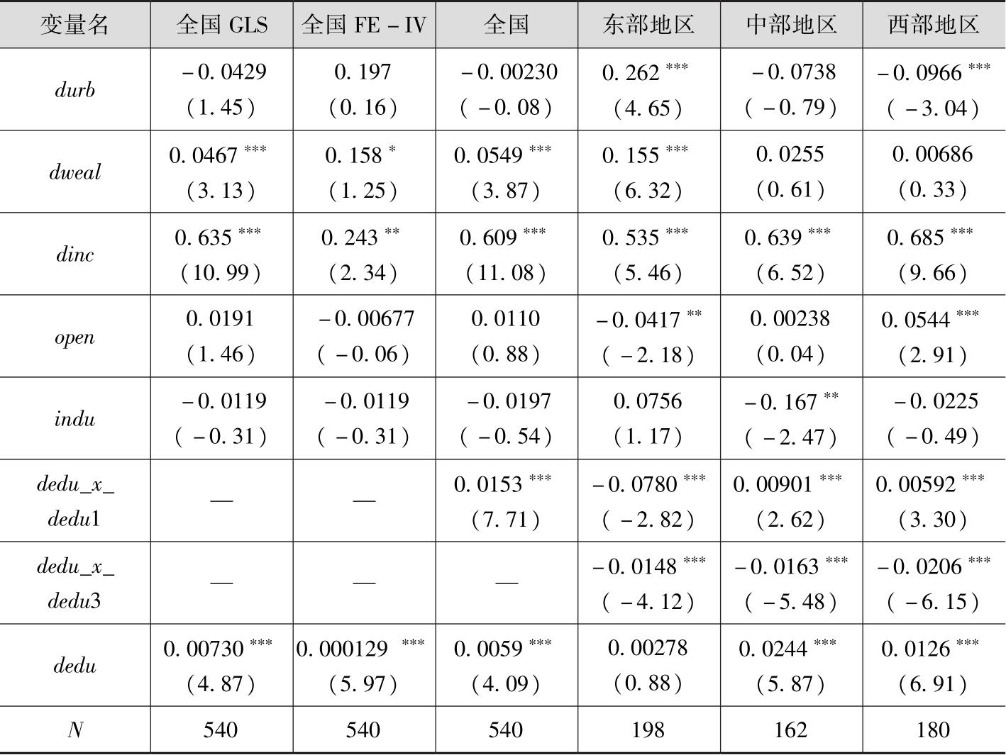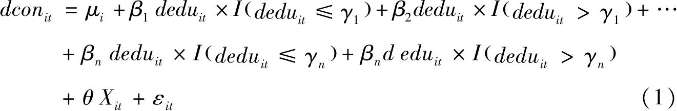 其中, dcon it 表示 t 时期 i 省城乡居民消费差距, dedu it 表示 t 时期 i 省教育投入不均,在此既代表核心解释变量,又代表门槛变量。 X it 表示 t 时期 i 省的城镇化水平、产业结构升级、经济开放度等控制变量。