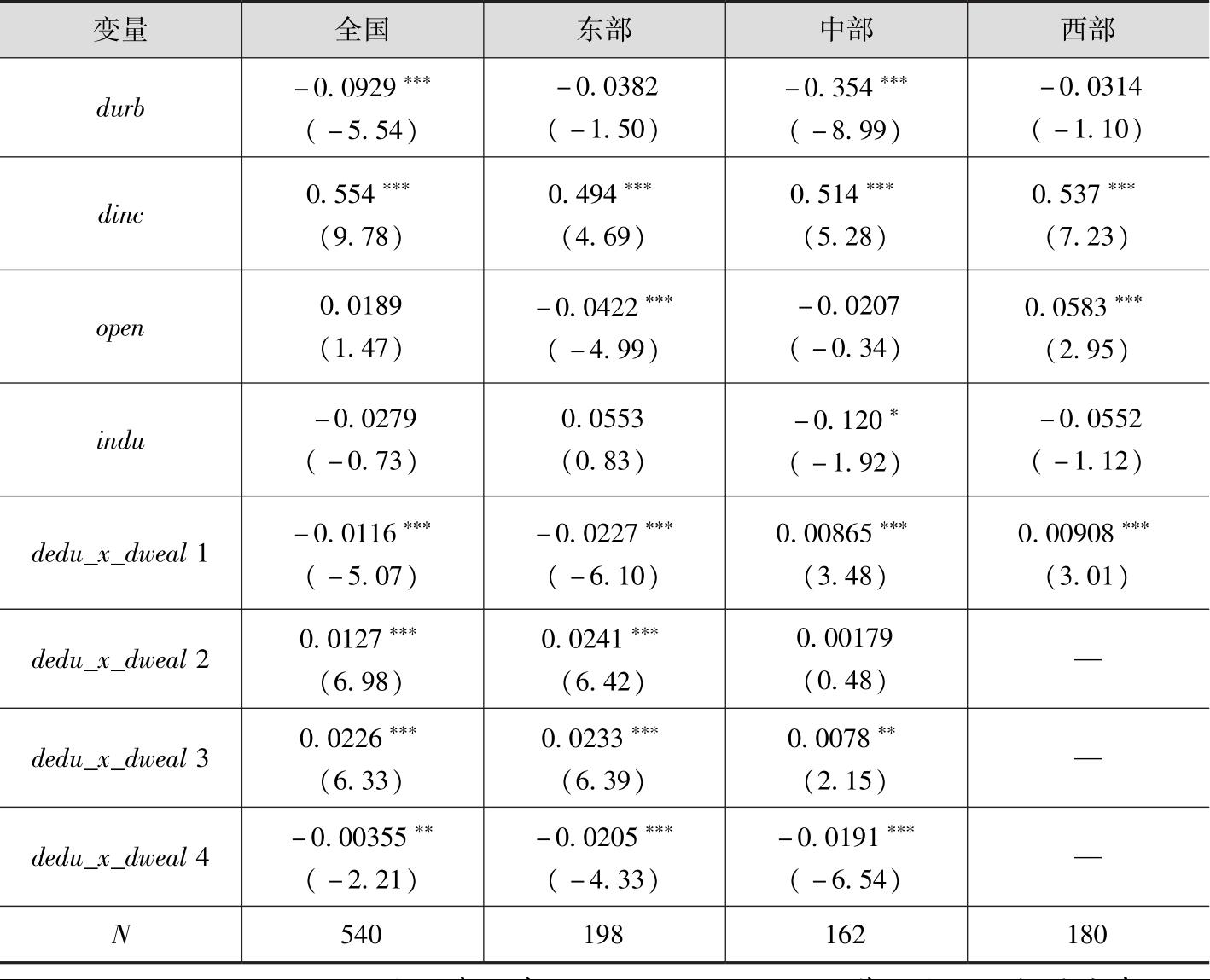 在改革开放40多年的发展中,我国各区域因发展政策、地理位置等因素形成东部、中部、西部发展严重不平衡的实际情况。基于此,在分析教育投入不均对城乡居民消费差距的影响时有必要考虑这一空间异质性因素,分别考察东部、中部、西部教育投入不均对城乡居民消费差距影响的门槛效应异同。在此,使用Hansen(2000)提出的“自举法”对全国及东部、中部、西部检验时,分别通过重叠模拟似然比检验统计量300次,结果表明全国在5%的显著性水平上通过了单门槛的自抽样检验,门槛值为3.661,95%置信区间为[0.407,3.707];东部地区在5%的显著性水平下通过了双重门槛效果的自抽样检验,门槛值为0.414和5.332,置信区间为[0.372,2.520]和[3.716,5.441];中部地区在1%的显著性水平下通过了双重门槛效果的自抽样检验,门槛值为1.745和3.913,95%的置信区间为[0.859,2.148]和[3.913,3.914];西部地区在5%的显著性水平下通过了双重门槛效果自抽样检验,门槛值为3.192和5.992,置信区间分别为[0.922,3.476]和[5.992,5.993]。为更清楚地显示教育投入不均对城乡居民消费差距影响的门槛效应变化趋势,将最小门槛值设为 dedu 1,最大门槛值设为 dedu 3,在Hausman检验的基础上,进一步对所有变量进行固定效应估计,得出全国及东部、中部、西部相关结果,如表2所示。