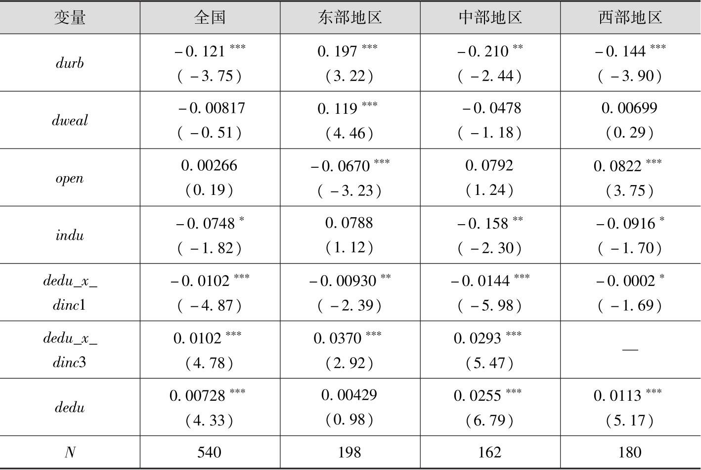 全国及东部、中部地区分别在1%或5%的显著性水平下通过了双重门槛效果自抽样检验:全国的门槛值为0.038和0.138,95%置信区间[0.031,0.075]和[0.031,0.158];东部地区的门槛值为0.138和0.210,95%的置信区间[0.047,0.155]和[0.155,0.210];中部地区的门槛值为0.076和0.136,95%的置信区间[0.076,0.083]和[0.038,0.137]。而西部地区仅在1%的显著性水平下通过了门槛效果自抽样检验,门槛值为0.073,95%的置信区间为[0.071,0.075]。将城乡收入差距在各区域的最小门槛值设为 dinc 1,最大门槛值设为 dinc 3,在Hausman检验的基础上,进一步对所有变量进行固定效应估计,具体结果见表3。