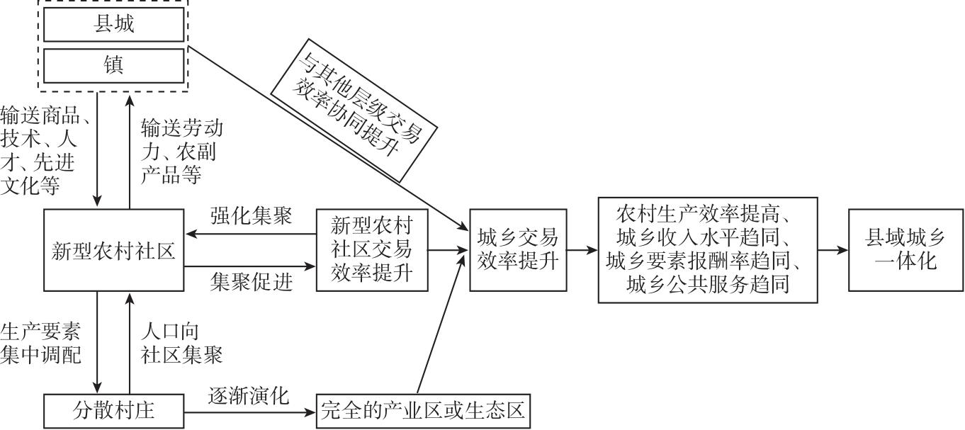 作为县域层级城乡体系的基层组成部分,新型农村社区推进县域城乡一体化的作用机理在于:随着社会主义市场经济在西部县域农村的发展,西部县域农村传统的封闭、单一、同质的乡村社会结构逐渐解体,农村的空心化问题日益严重,时代呼唤西部县域农村新的治理结构和要素承载框架的出现。西部部分县域试点试验表明,新型农村社区建设是新型城镇化推进的关键,是乡村振兴的重点内容。新型农村社区建设将在较大程度上改善农村破败的形象,给分散在社区周边的居民提供就地共享城镇文明的机会,促使农村分散的人口在空间上相对集聚。人口的集聚将带来土地的节约,为土地的流转和组织化、规模化运营奠定了基础;人口的集聚也将导致城乡信息和其他生产要素在社区的集聚,促使社区成为周边农村的要素和资源集聚中心。要素的集聚将引致社区级别的规模效应,从而对提高农村生产效率和城乡交易效率产生积极影响,最终促使农村生产要素的报酬率不断提高,社区居民的收入与其他城镇居民收入水平趋于收敛。随着新型农村社区基础设施和治理机制的不断完善,新型农村社区与其他层级城乡体系的交易活动更加顺畅,这反过来又进一步促进了新型农村社区的发展。如此循环往复,直到新型农村社区与其他层级城镇在生活效用、居民收入、生态环境等的差距全方面缩小,此时新型农村社区与县域其他地区实现了高水平均衡发展,县域也就实现了城乡一体化发展的目标。这一作用机理可简单地表示为“农村经济社会的新变化—新型农村社区建设引致人口的集聚—农村居民生活环境改善—土地、信息等其他生产要素和资源的集聚—农村生产率提高、要素报酬率提高、交易效率提高—城乡之间的公平交易更加顺畅—城乡在高水平上均衡发展—县域城乡一体化”(见图4)。