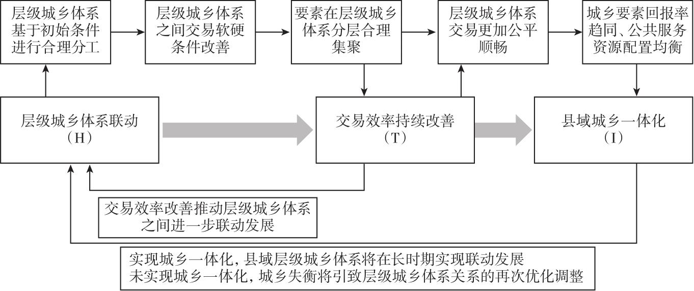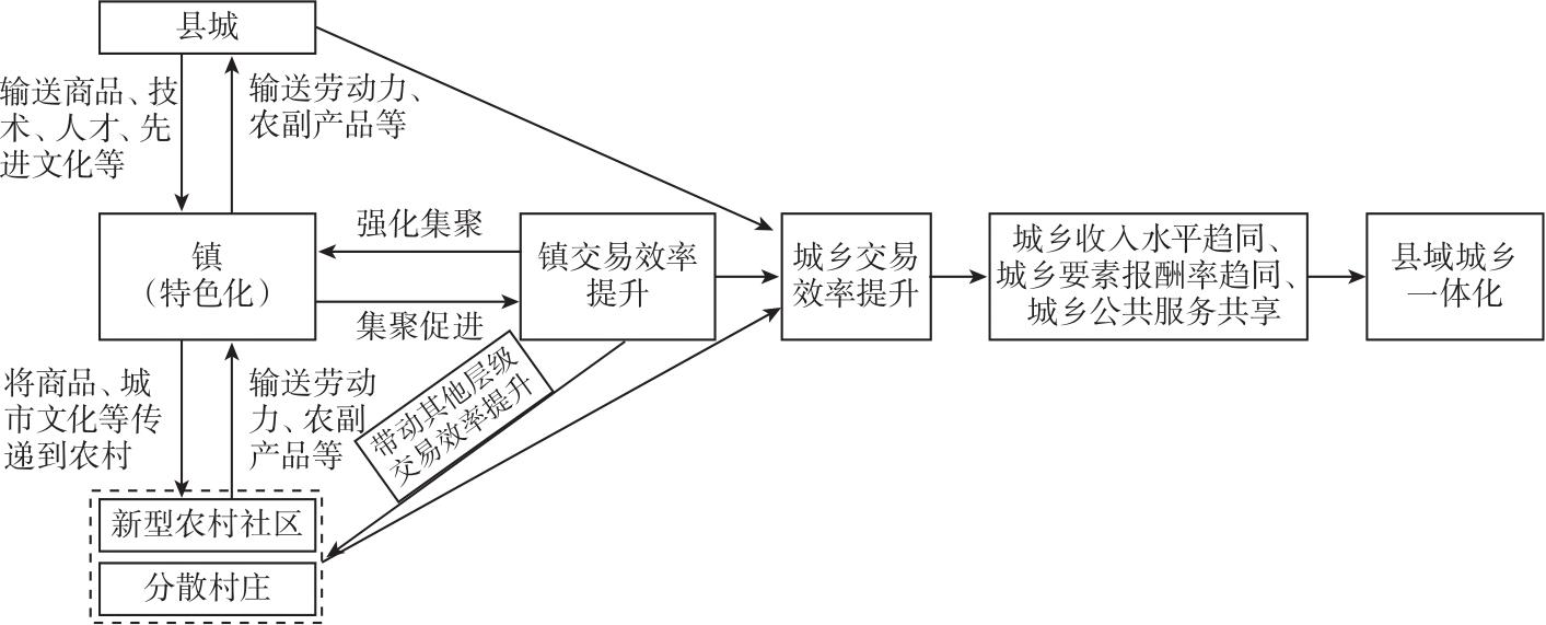 镇在县域城乡关系中居于承上启下的地位,由于其“城之尾、乡之首”的特征,使其在县域城乡一体化推进过程中具有独具特色的作用。镇在县域城乡一体化的作用机理在于:作为层级城乡体系的中间组成部分,农村居民的交易需求引致农村集镇的出现和发展,提升了城乡产品、要素之间的交易效率,推动了城乡生产效率的提高;生产效率的提高进一步丰富了城乡交易商品的种类和数量,大大扩展了城乡交易市场需求规模,于是在地理区位优越、经济社会发展基础雄厚、体制机制障碍较少的镇里生产要素和产品出现了进一步的聚集,推动交易效率的进一步提高,而交易效率的提高,又能显著提升生产效率和扩大市场需求;如此循环往复,直到交易效率提高不再引致进一步市场交易需求的拓展为止,这时候镇发展的规模也就达到了边界,城乡之间交易效率提高达到平衡状态,城乡之间的要素报酬趋同、城乡居民生活获得感趋同,县域城乡一体化最终实现。