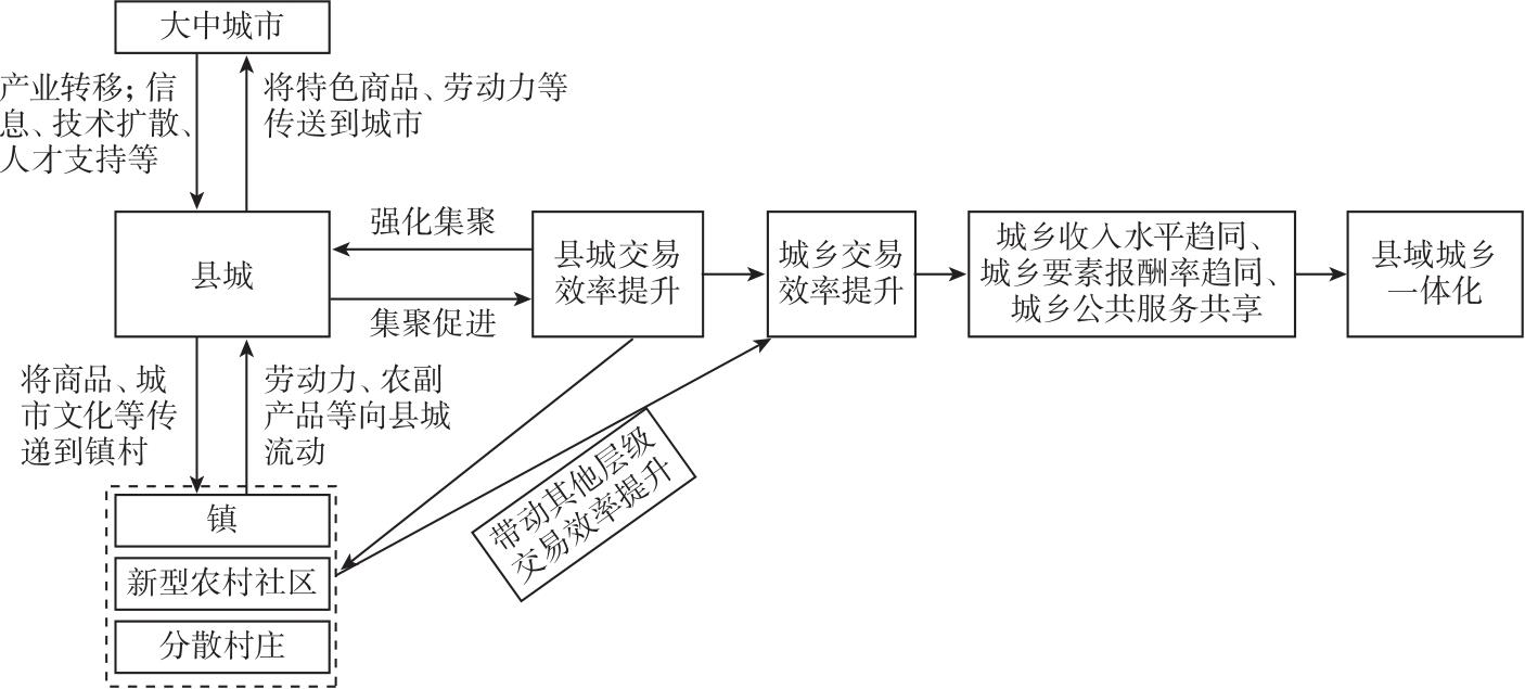 西部地区县城推进县域城乡一体化的作用机理在于:西部地区县域城乡一体化的低水平与县城作为县域中心城镇的交易效率低有较大关系。较低的交易效率水平引致较弱的辐射带动作用,较弱的辐射带动作用引致西部地区县域城乡一体化长期处于低水平发展,与大中城市高水平的发展鸿沟不断拉大。推动西部地区县域城乡二元结构的转变,关键在于提升县域城乡交易效率,尤其是作为县域中心城镇县城的交易效率。县城交易效率的改善,一方面,将吸引县域生产要素向县城集聚,集聚产生更高的交易效率,更高的交易效率引致更高的集聚水平,从而不断推进县城发展壮大,成为县域经济发展的真正核心动力;另一方面,交易效率的提升将强化县城与其他乡镇及农村之间的生产分工,提升县域层级城乡体系的分工专业化水平,从而降低资源的稀缺性并提高县域城乡财富的创造力。县城交易效率在不断提升过程中,县城的发展水平、县域财富的增长将同步提升,县城的辐射带动作用、承接作用的发挥将不断吸收农村转移的剩余劳动力,从而引致农村生产要素集聚水平的提升和交易环境的深刻变化,最终实现县域城乡要素报酬趋同、生活环境一体,县域城乡真正实现一体化发展的目标。
