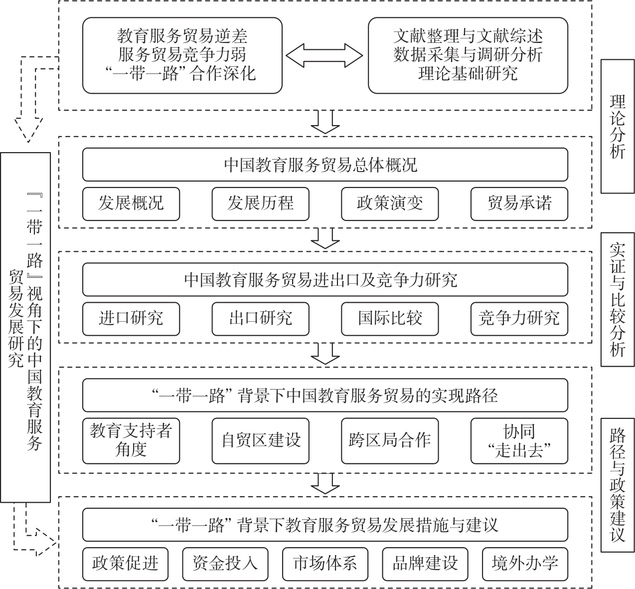 教育服务贸易是涉及国家与国家之间、地区与地区之间的高等教育,在经济全球化的背景下,服务贸易逐渐步入高速发展时期,尤其是高等教育服务贸易已经发展为一个较为成熟且前景光明的新兴发展领域。从全球市场来看,教育服务贸易发展存在严重不平衡的现象,教育的主要出口国为发达国家,教育的主要进口国为发展中国家。中国是国际教育市场的最大消费者,在全球市场中的竞争优势不明显,存在教育服务贸易逆差巨大、国内教育区域供给不平衡、教育经济效益较低、国际竞争力不强等问题。“一带一路”倡议为中国教育服务贸易发展带来了重要的历史发展机遇,拓展与沿线国家的教育服务贸易发展空间是中国教育服务贸易发展的重要方向。基于此,本课题在中国国际教育服务贸易发展面临“瓶颈”的情况下,从“一带一路”视角出发,探索解决中国教育服务贸易发展的方式和对策。本书主要从教育服务贸易发展政策与历程、教育服务进出口情况和教育服务贸易发展的实现路径与对策三个部分展开研究。第一部分为教育服务贸易的总体概况,首先对教育服务贸易发展的主要理论及观点进行了梳理,其次对中国教育服务贸易发展概况进行了分析,从历史的角度对教育服务贸易不同发展阶段的政策演变及特点进行分析和总结,并基于WTO框架对高等教育服务贸易承诺以来中国教育服务贸易的发展进行了剖析,因而实现了对中国教育服务贸易的全方位和客观了解。第二部分围绕教育服务进出口及国际竞争力展开研究,主要从教育服务进出口现状、市场分布、结构、效应等角度进行分析,并对中国与主要国家的教育服务贸易从政策、市场、价格、方式等方面进行全面比较,从而有效把握中国教育服务国际竞争力的基本情况、影响因素和具体优势。第三部分是基于“一带一路”背景探索中国教育服务贸易的实现方式和路径,主要从博弈论视角分析教育服务贸易支持者及行为、教育开放进程中的自贸区与教育服务贸易发展、内陆地区尤其是西北五省区与中亚五国高等教育跨区域合作构想、职业教育与行业企业协同“走出去”模式构建与推进策略、“一带一路”背景下职业教育服务贸易发展新思路、“一带一路”背景下教育服务贸易发展措施与建议等方面进行了深入分析和研究。