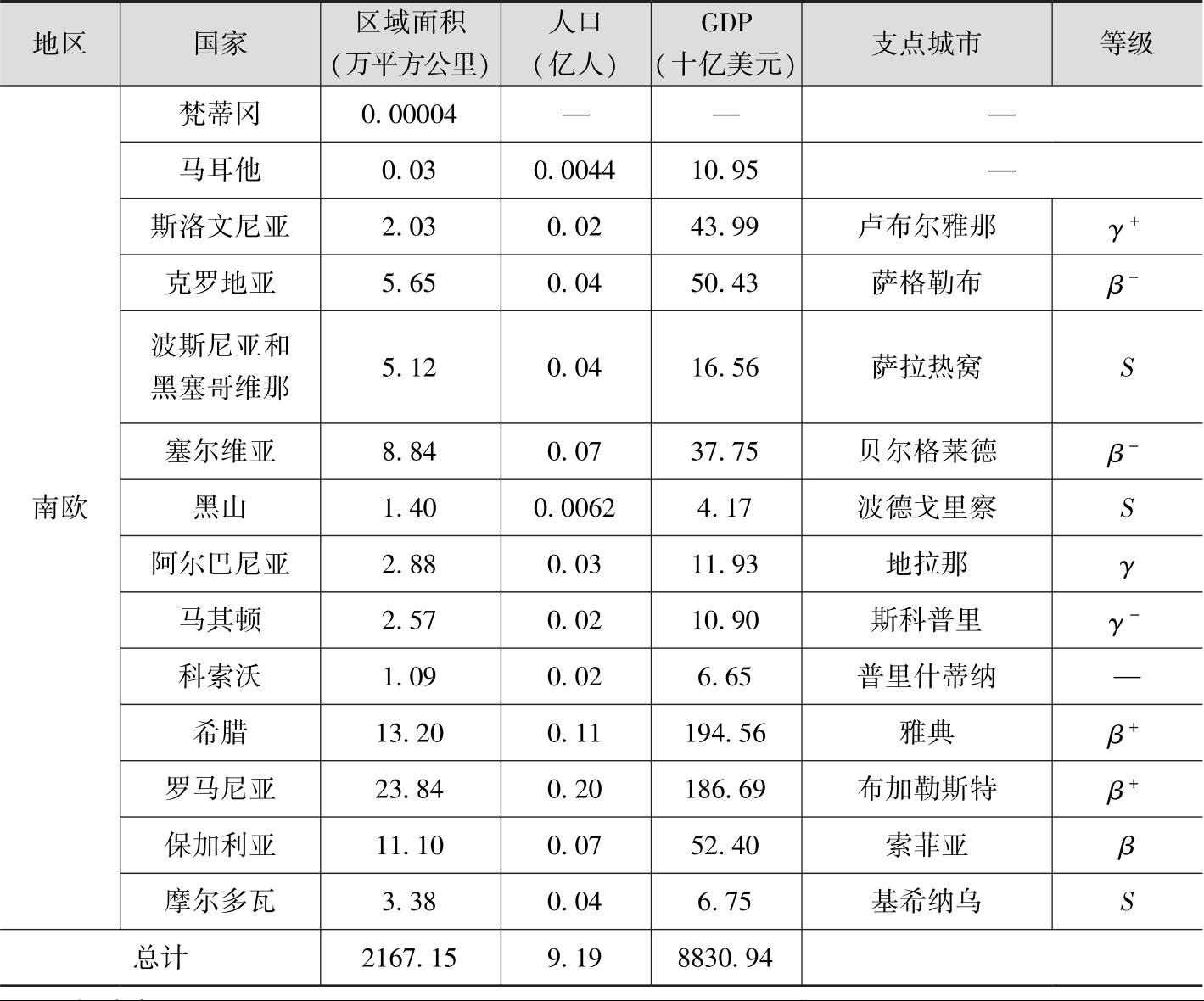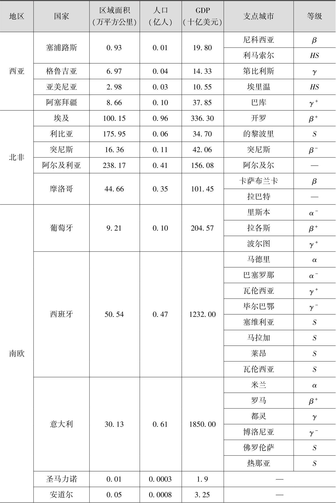 地中海南岸的南欧经济较为发达,该区域拥有意大利、西班牙、葡萄牙等发达国家,形成了以米兰、罗马、马德里、巴塞罗那、里斯本等城市为主的环阿尔卑斯山经济圈,汇聚了数量较多的世界城市。该区域的巴尔干半岛拥有较多的世界城市,但经济发展水平仍有待提升。