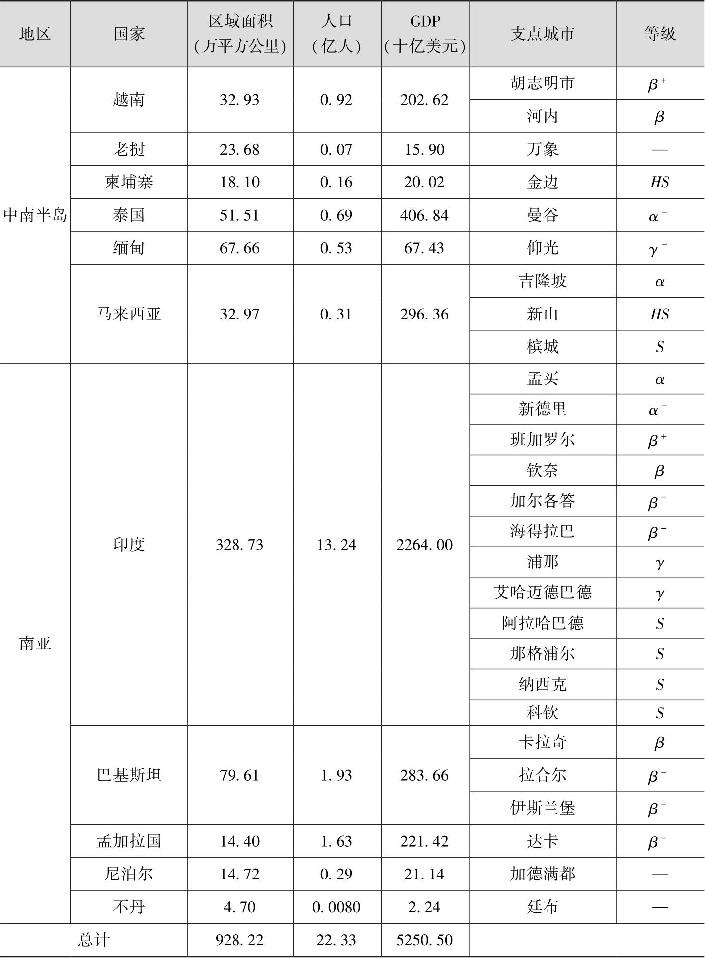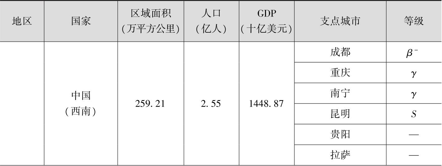 南亚次大陆包括印度、巴基斯坦、孟加拉国、尼泊尔、不丹等国家。印度、巴基斯坦、孟加拉国人口数量众多,尤以印度为最。印度2016年人口13.24亿,占南亚总人口的77.43%;GDP为22640亿美元,占南亚GDP总量的81.08%;国土面积328.73万平方公里,占南亚总面积的74.35%。印度境内有孟买、新德里、班加罗尔等12个世界城市,巴基斯坦拥有卡拉奇、伊斯兰堡和拉合尔3个世界城市,孟加拉国拥有的世界城市是达卡。总体而言,南亚各国的经济发展大都处于上升期,能够支撑丝绸之路经济带建设的支点城市数量将不断增加(见表4)。