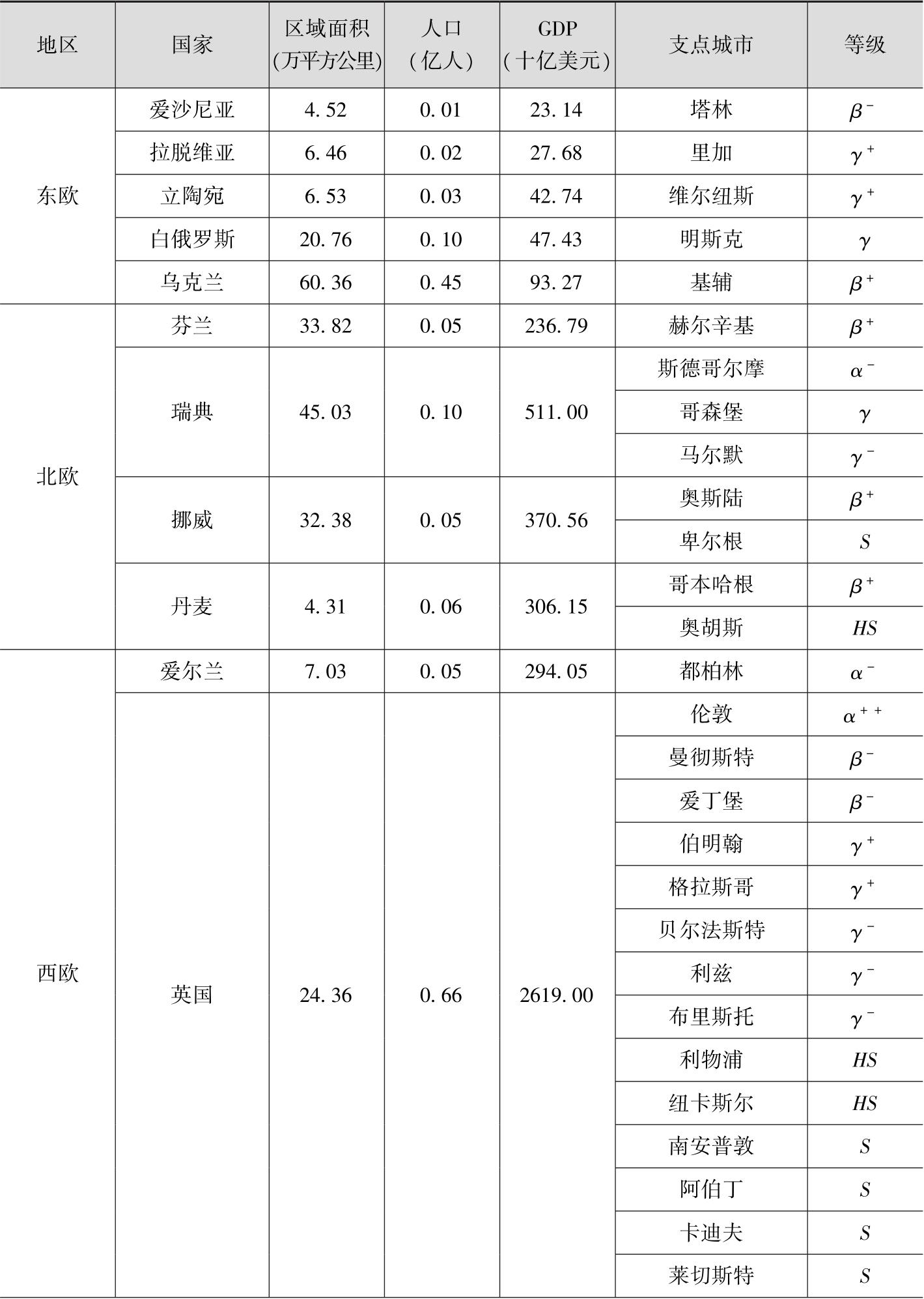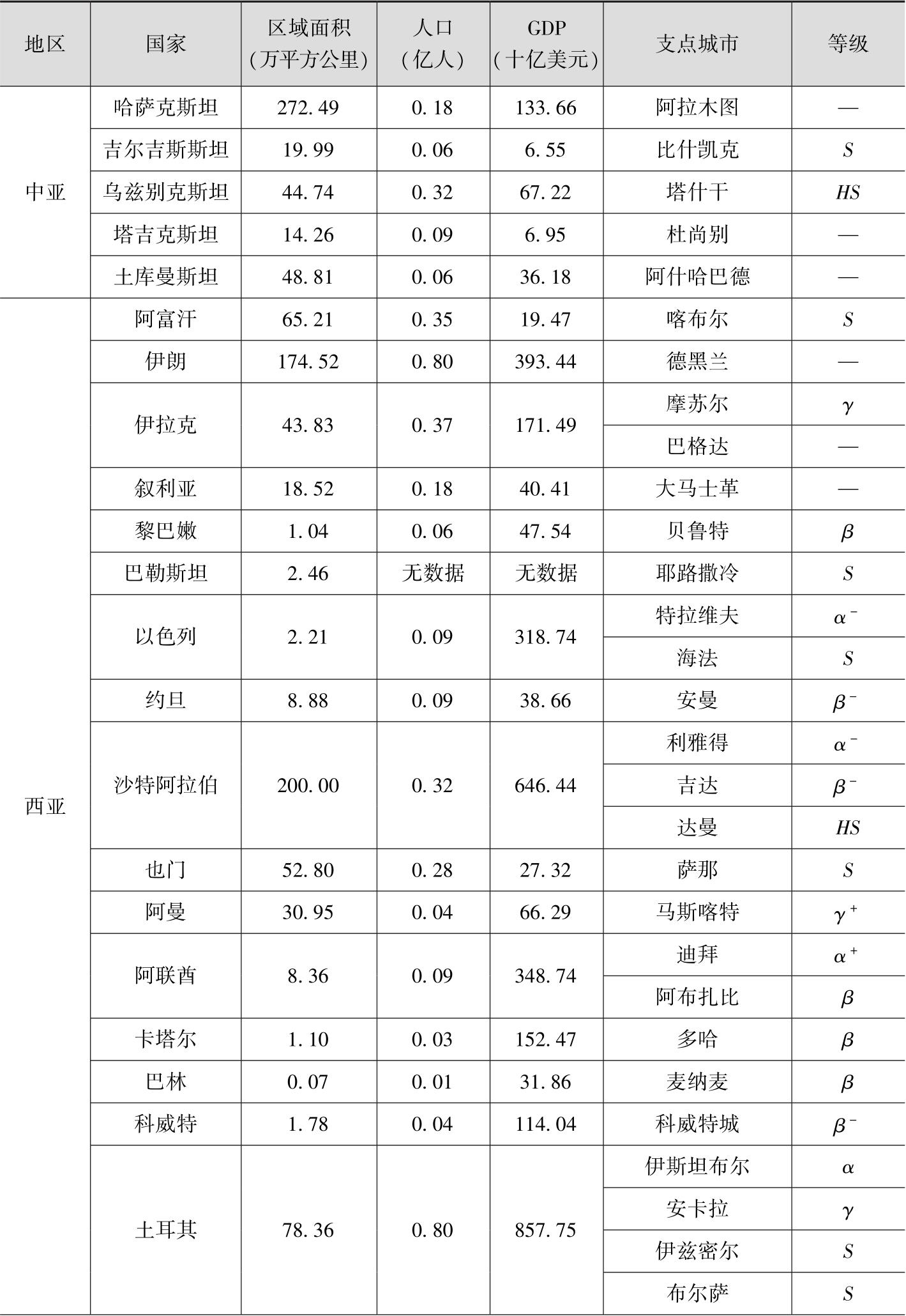 基于对丝绸之路经济带支点城市的界定以及学术界研究现状,为保证支点城市选取的科学性和权威性,我们主要依据英国拉夫堡大学全球化与世界城市(Globalization and World Cities,GaWC)研究组织(Research Network)公布的2016年世界城市名单。英国拉夫堡大学全球化与世界城市研究组织侧重于评价城市发展水平,尤其是评价城市之间的对外联系强度,该组织定期推出世界城市名单,在全球范围内产生了广泛影响。英国拉夫堡大学全球化与世界城市研究组织把世界城市分为五个总等级,分别是 α β γ 、High Sufficiency( HS )、Sufficiency( S )。其中, α 等级又细分为 α ++ α α α - β 等级细分为 β β β - γ 等级细分为 γ γ γ - HS S 并未进一步细分。根据英国拉夫堡大学全球化与世界城市研究组织公布的2016年世界城市名单,中国大陆有26个世界城市,中国港澳台地区有5个世界城市。