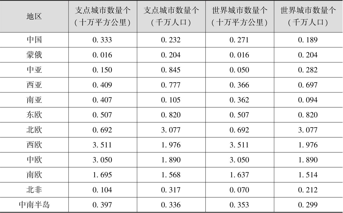 表8 丝绸之路经济带沿线各地区的支点城市密度