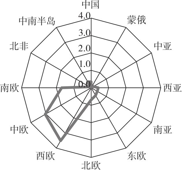 从各地区的空间集聚来看(表8、图1),西欧、中欧的空间集聚水平远高于其他地区,每十万平方公里的支点城市数量超过3个;南欧的空间集聚水平较高,每十万平方公里的支点城市数量接近1.7个;北欧、东欧的空间集聚水平居中,每十万平方公里的支点城市数量介于0.5~0.7个;中国、西亚、南亚、中南半岛的空间集聚水平较低,每十万平方公里的支点城市数量为0.4个左右;中亚、北非、蒙俄的空间集聚水平很低,每十万平方公里的支点城市数量少于0.15个,这跟三个地区地广人稀有很大关系。