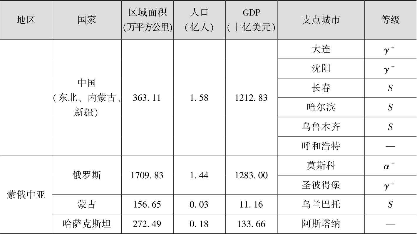 丝绸之路经济带北线中段的蒙古、俄罗斯、哈萨克斯坦地域辽阔,三个国家的国土面积共有2138.97万平方公里,占丝绸之路经济带北线地域总面积的73.46%;与广袤疆土相异的是,俄罗斯、哈萨克斯坦、蒙古的人口及GDP总量却相对较小,分别仅占丝绸之路经济带北线区域的22.28%和8.72%。受人口密度和经济发展水平的限制,三国境内的世界城市数量很少。蒙古国境内的唯一世界城市是其首都乌兰巴托,世界城市级别较低;俄罗斯境内的两个世界城市是地处欧洲的莫斯科和圣彼得堡;哈萨克斯坦没有城市入围世界城市。