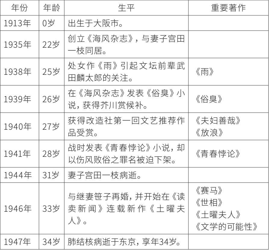 织田作之助,小说家,别名“织田作”,1913年10月26日出生于大阪,是天妇罗餐厅家的长男。他从小体弱多病,虽因此未能完成学业,却凭着一身才华一步步地从剧本作家晋身为文学家。他1935年与好友共同创立《海风杂志》;1938年发表首篇小说《雨》,备受同乡前辈作家武田麟太郎(1904—1946)注目;1939年发表《俗臭》获芥川赏候补;1940年以短篇小说《夫妇善哉》获改造社第一回文艺推荐作品奖,成为文坛闪亮新星。