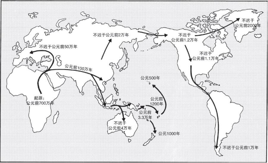 从约700万年前人类起源开始,人类在非洲生活了五六百万年,然后才走出非洲,逐渐散布到全球(图1.1)。第一批走出非洲的人类祖先是直立人,其化石证据是在东南亚的爪哇岛发现的“爪哇人”(Java man)。过去学者推断,最古老的爪哇人化石( Homo erectus )的年代在约100万年前,近来则有人提出年代是在180万年前。(严格来说, Homo erectus 是用来称呼这些爪哇人化石的,非洲的直立人化石或许也该有不同的称法。)目前没有争议的人类在欧洲最早的活动遗迹,是约50万年前留下的,不过有学者指出还有更早的。我们相信人类进驻亚洲与欧洲的时间不会相隔太久,因为欧洲、亚洲位于同一块大陆上,其间并无难以逾越的障碍。