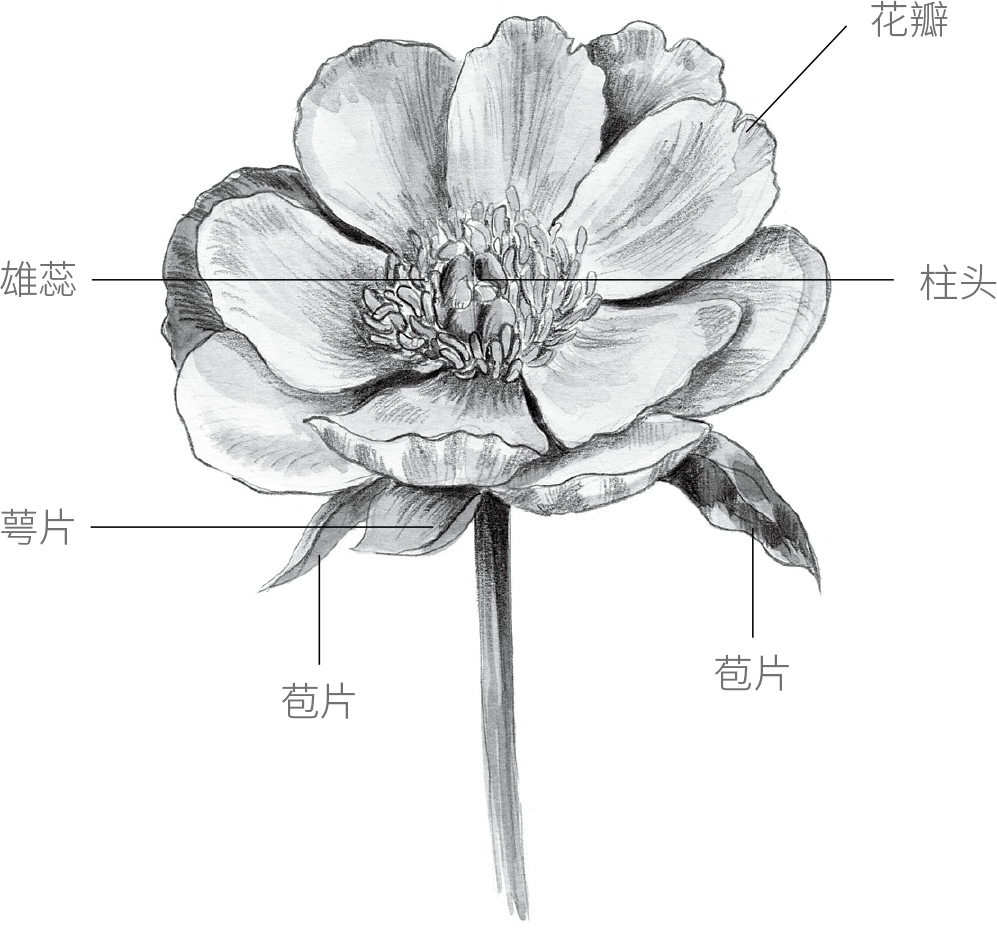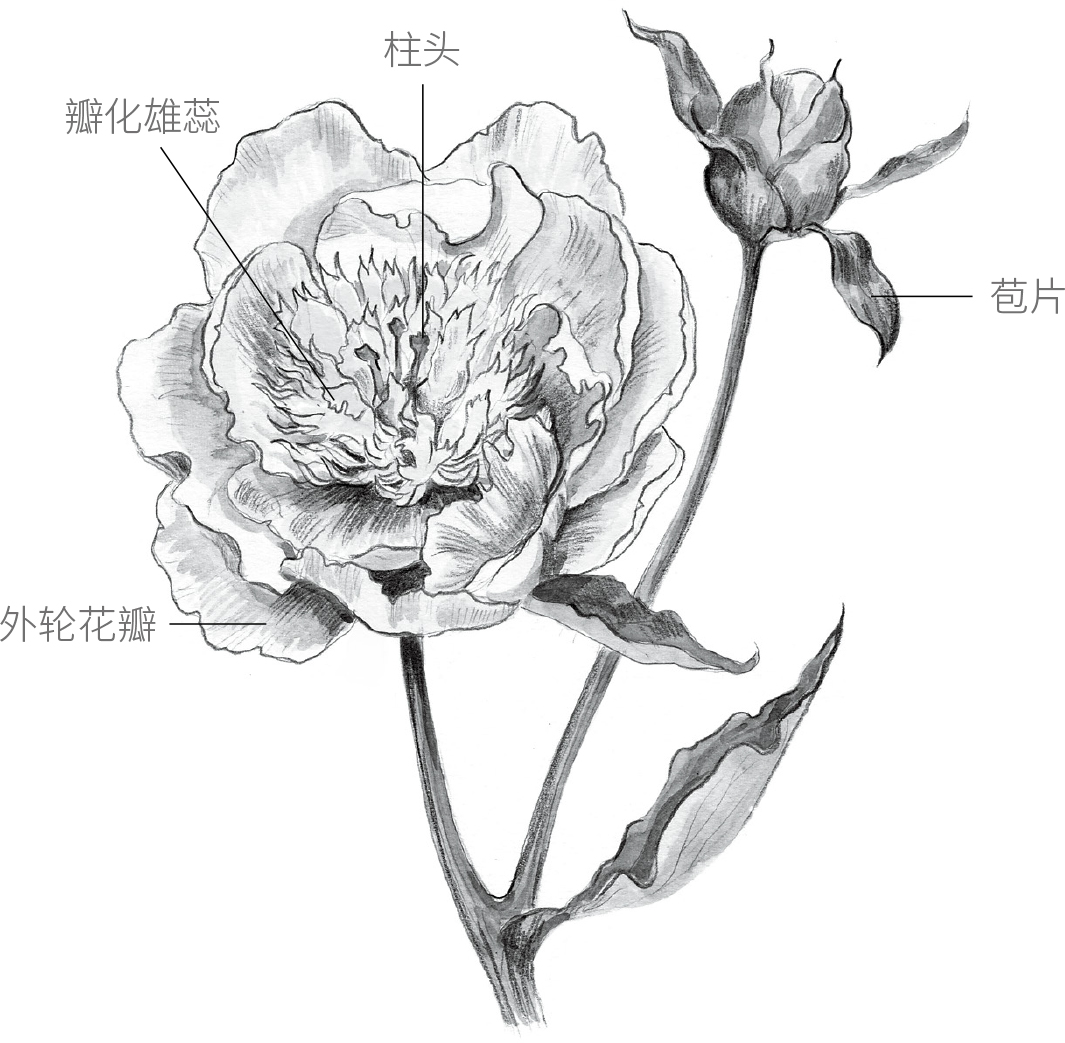 牡丹或芍药花的组成部分包括:包裹在花蕾之外的绿色的苞片和萼片、花瓣、雄蕊(雄蕊由花丝及其顶端支撑的花药构成,其中花药承载着花粉)、雌蕊。雌蕊的心皮是种子孕育的地方。心皮的顶端是潮湿的柱头,它负责接收花粉,完成受精。