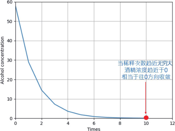 下图说明,当酒精稀释次数趋近于 无穷大∞ 时,结果趋近于0。