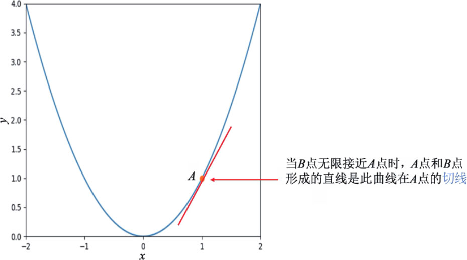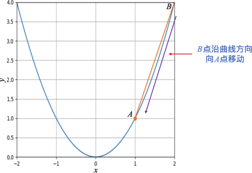 很明显,上述曲线上的任意2点形成的直线的斜率均无法当作此曲线上 A 点处切线的斜率,如果要计算曲线上 A 点处切线的斜率,必须将 B 点移向 A 点,如下所示: