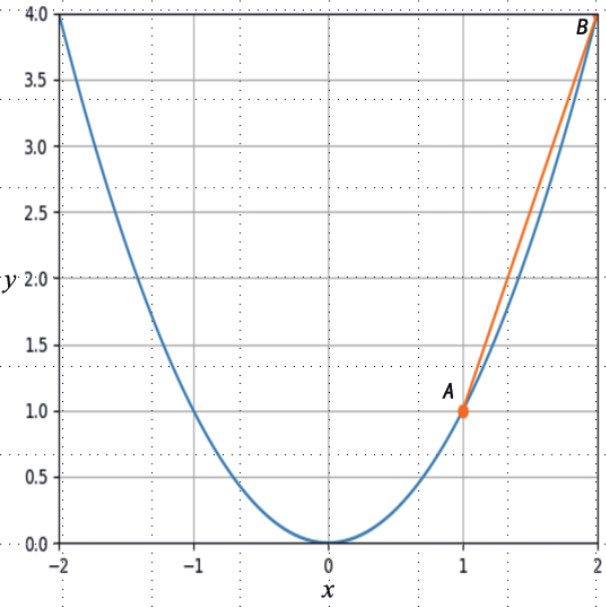 假设现在想计算曲线 y = x 2 上的 A B 形成的直线 AB 的斜率,使用我们已经知道的概念,可以使用下图表达。